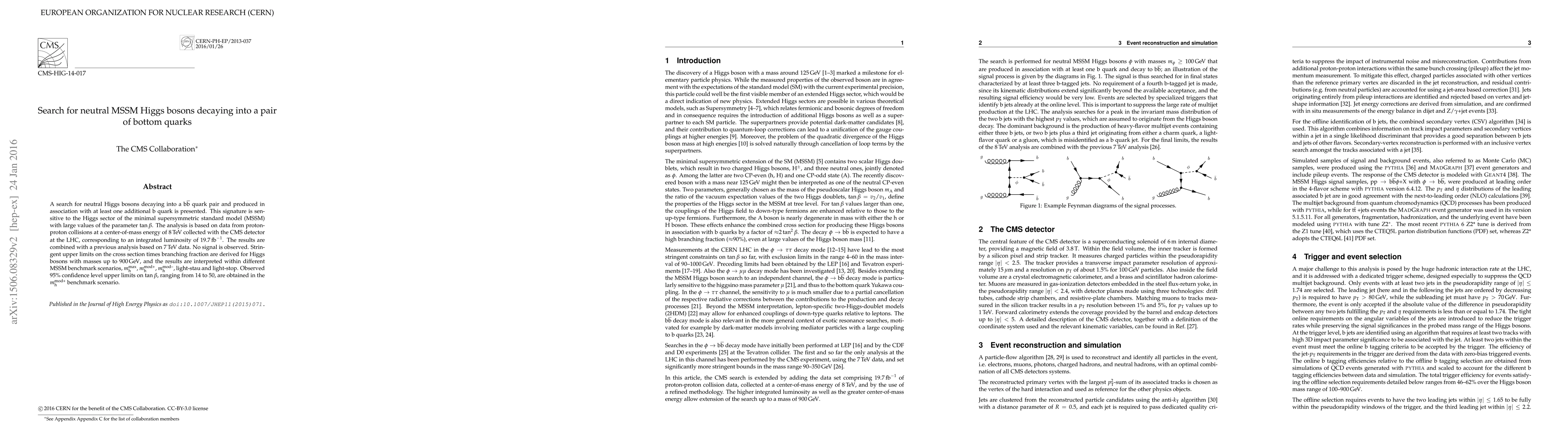 This research presents a search for neutral Higgs bosons decaying into bottom quark pairs in proton-proton collisions at 8 TeV LHC, with additional b-quarks. No signal was found, leading to stringent upper limits on cross section times branching fraction for Higgs masses up to 900 GeV. These results are interpreted within various MSSM benchmark scenarios, providing observed 95% confidence limits on tan(beta) ranging from 14 to 50 in the m[h,mod+] scenario.