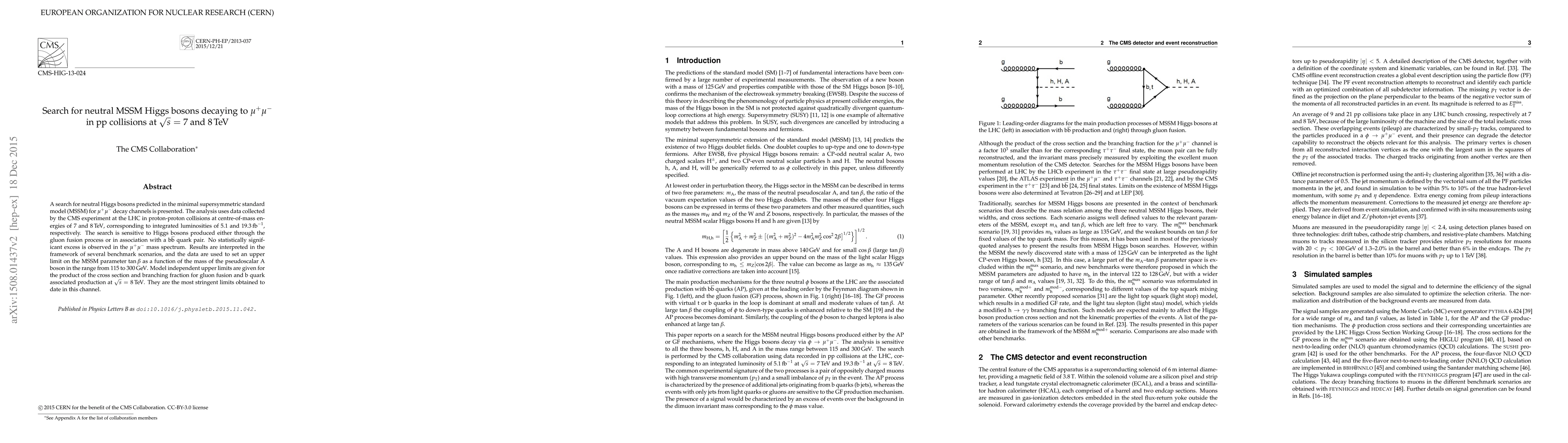 Researchers searched for neutral Higgs bosons predicted in the minimal supersymmetric standard model (MSSM) that decay into mu+ mu- in proton-proton collisions at 7 and 8 TeV energies, finding no statistically significant excess.