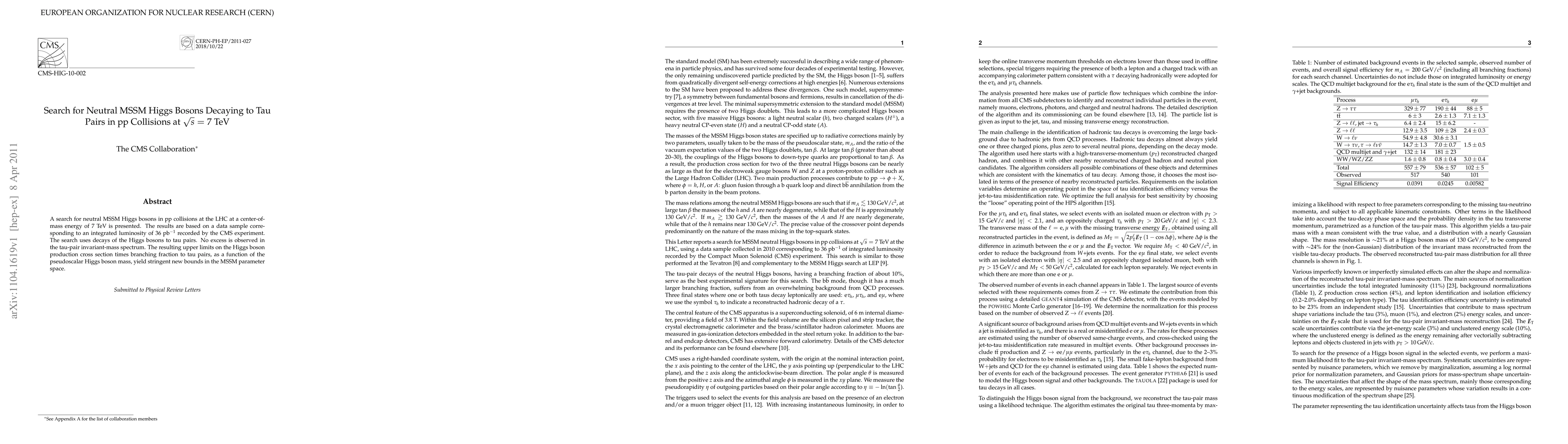 A search for neutral MSSM Higgs bosons in pp collisions at the LHC at a center-of-mass energy of 7 TeV is presented. The results are based on a data sample corresponding to an integrated luminosity of 36 inverse picobarns recorded by the CMS experiment. The search uses decays of the Higgs bosons to tau pairs. No excess is observed in the tau-pair invariant-mass spectrum. The resulting upper limits on the Higgs boson production cross section times branching fraction to tau pairs, as a function of the pseudoscalar Higgs boson mass, yield stringent new bounds in the MSSM parameter space.