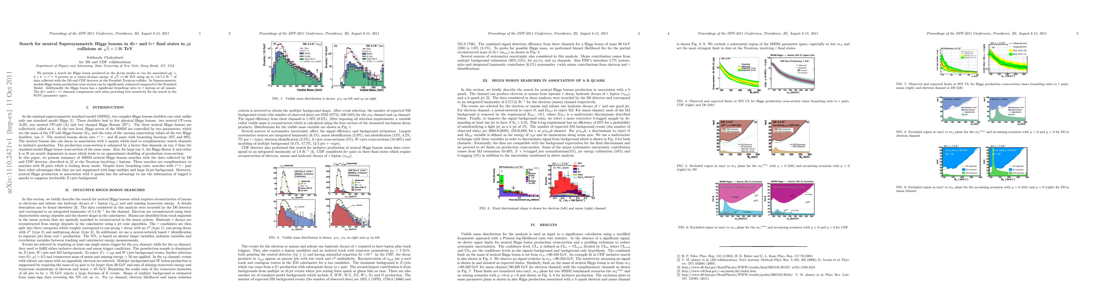 This paper investigates neutral Supersymmetric Higgs bosons in di-$\tau$ and $b\tau\tau$ final states at a center-of-mass energy of 1.96 TeV using data from the D0 and CDF detectors at the Tevatron collider. The search focuses on enhanced production cross sections and significant branching ratios to $\tau$ leptons in Supersymmetric models.