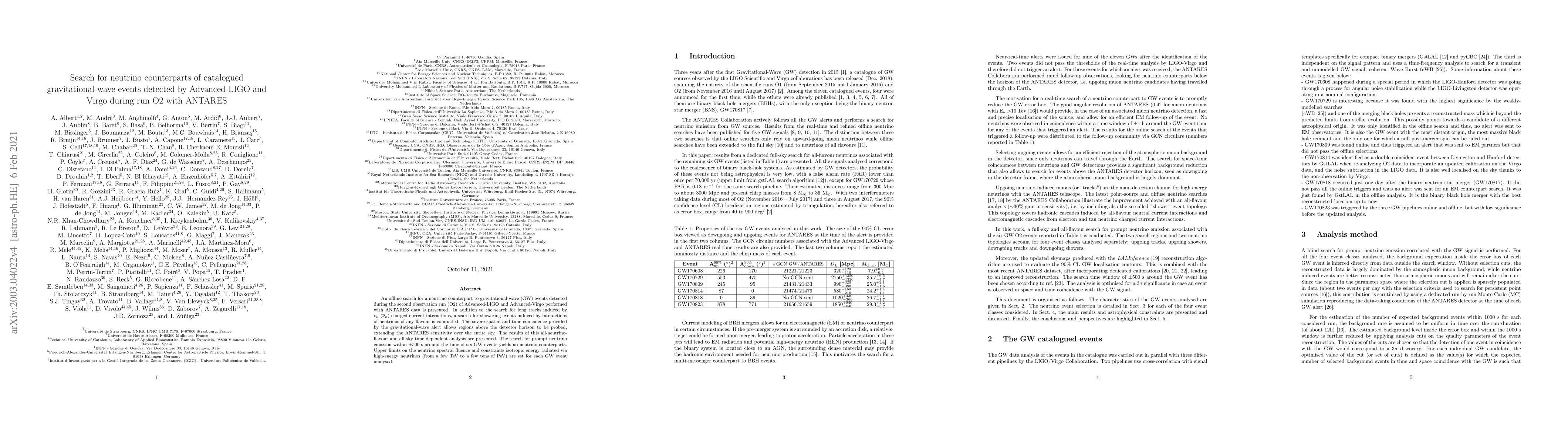 This paper reports an offline search for neutrino counterparts to gravitational-wave events detected by LIGO and Virgo during their O2 run using the ANTARES telescope. The search found no neutrino counterparts within ±500 seconds of the GW events, establishing upper limits on neutrino spectral fluence and constraining the isotropic radiated energy for each event.