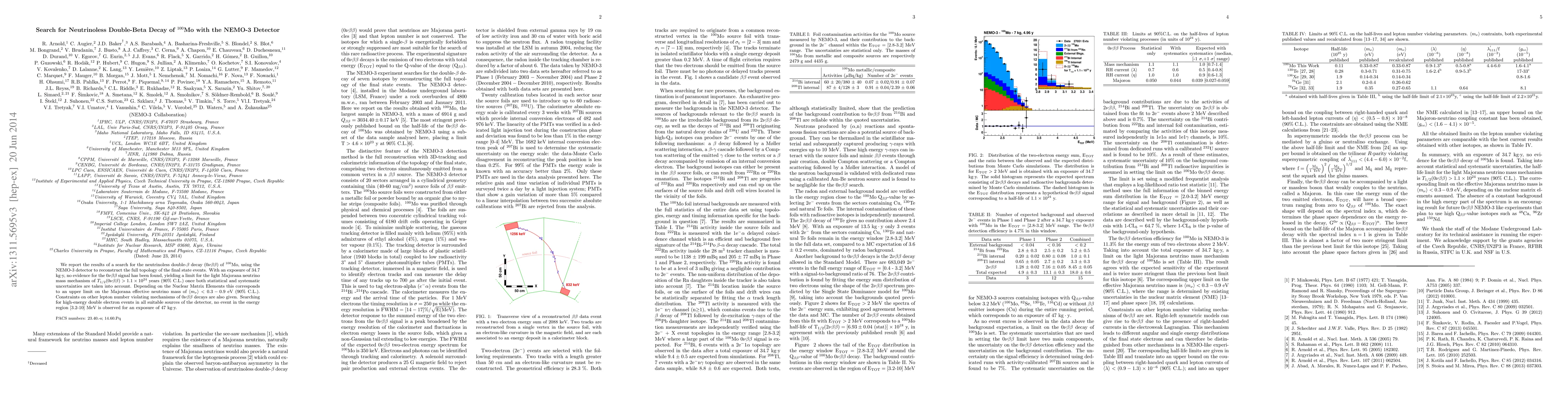 The NEMO-3 detector searched for neutrinoless double-beta decay of 100Mo and found no evidence, setting a limit on the Majorana neutrino mass mechanism and upper bound on the effective neutrino mass.