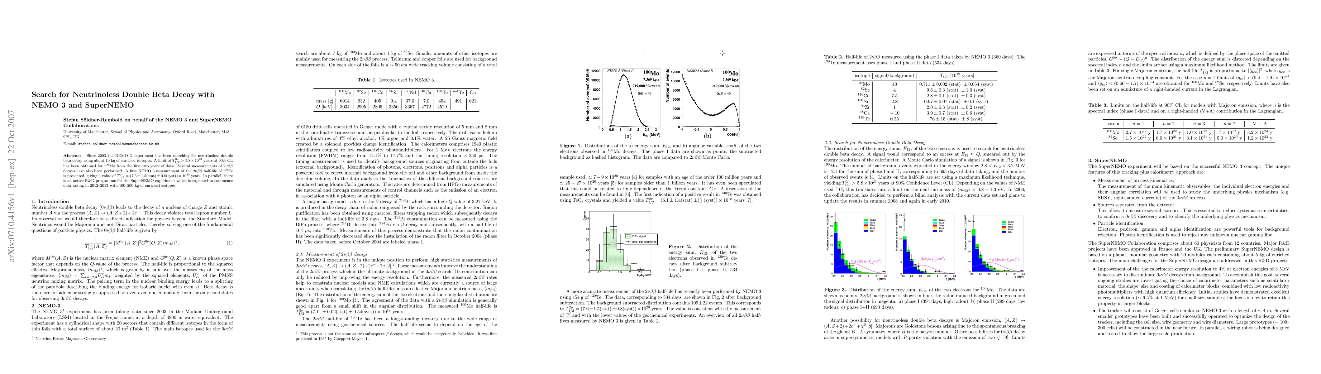 The NEMO 3 experiment has searched for neutrinoless double beta decay using enriched isotopes, setting a limit of T_(1/2)(0nu) > 5.8 x 10^23 years for 100-Mo. It also measured the half-life of 130-Te at T_(1/2)(2nu) = (7.6 ± 1.5) x 10^20 years. The SuperNEMO experiment is planned to start in 2012-2013 with increased sensitivity.