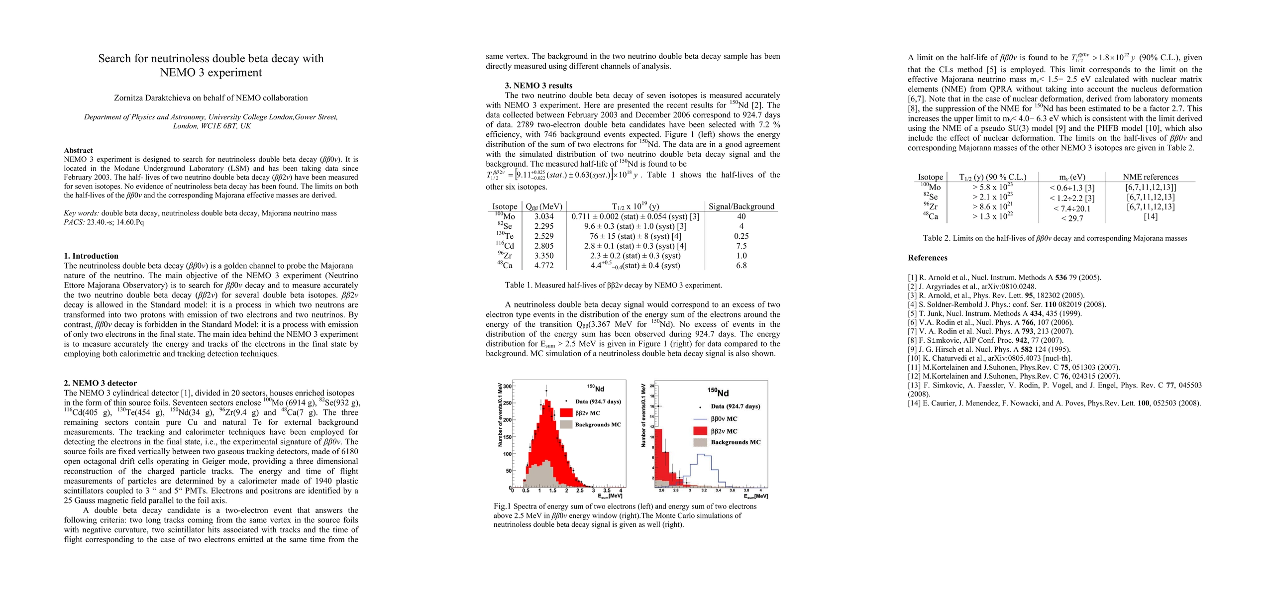 Summary: The NEMO 3 experiment at the Modane Underground Laboratory aims to detect neutrinoless double beta decay but finds no evidence; it measures half-lives for seven isotopes and establishes limits on the decay and Majorana effective masses.