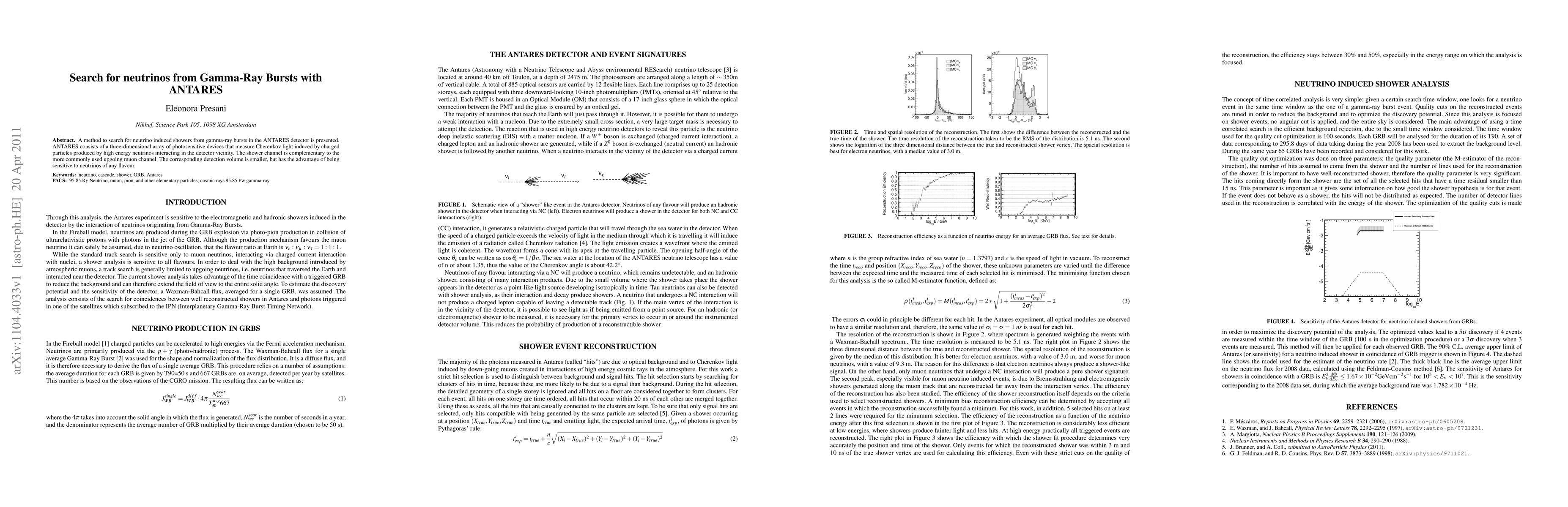 The paper presents a method to detect neutrino-induced showers from gamma-ray bursts using the ANTARES detector, which measures Cherenkov light from charged particles. The shower channel complements the upgoing muon channel, offering sensitivity to neutrinos of any flavor despite a smaller detection volume.