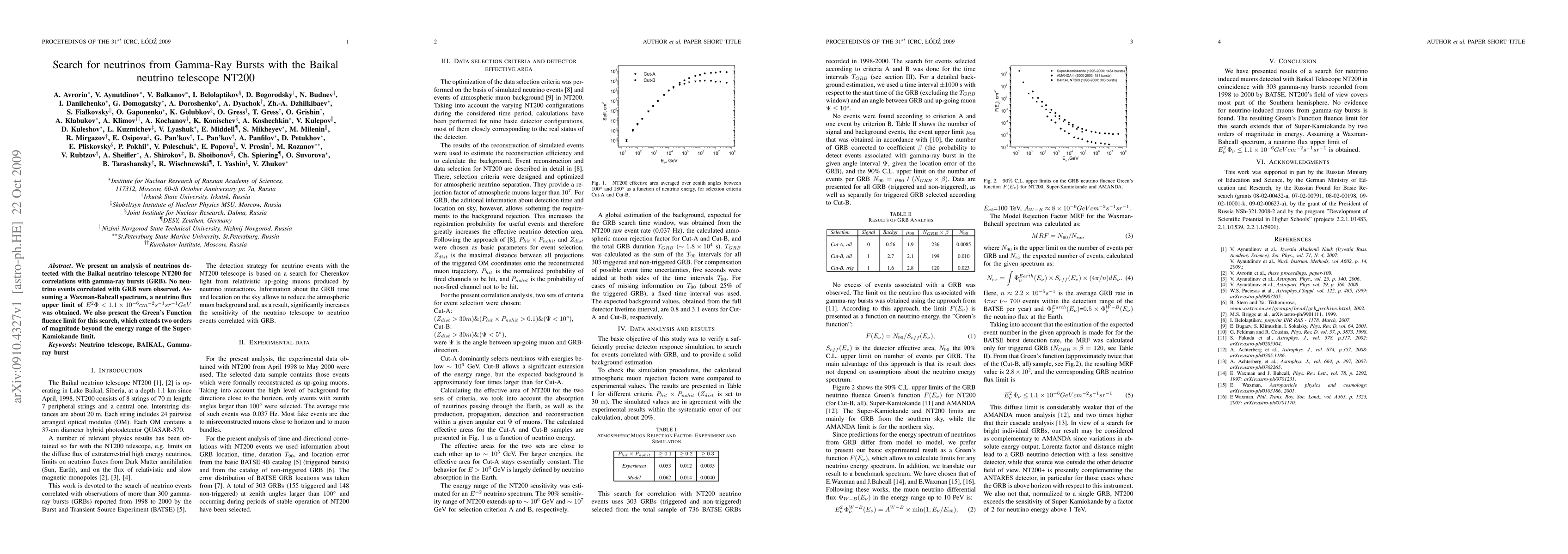 The Baikal neutrino telescope NT200 detected no neutrinos correlated with gamma-ray bursts (GRB), establishing an upper limit on neutrino flux and extending the Green's Function fluence limit beyond the Super-Kamiokande range. This analysis provides stringent constraints on neutrino emission from GRBs.
