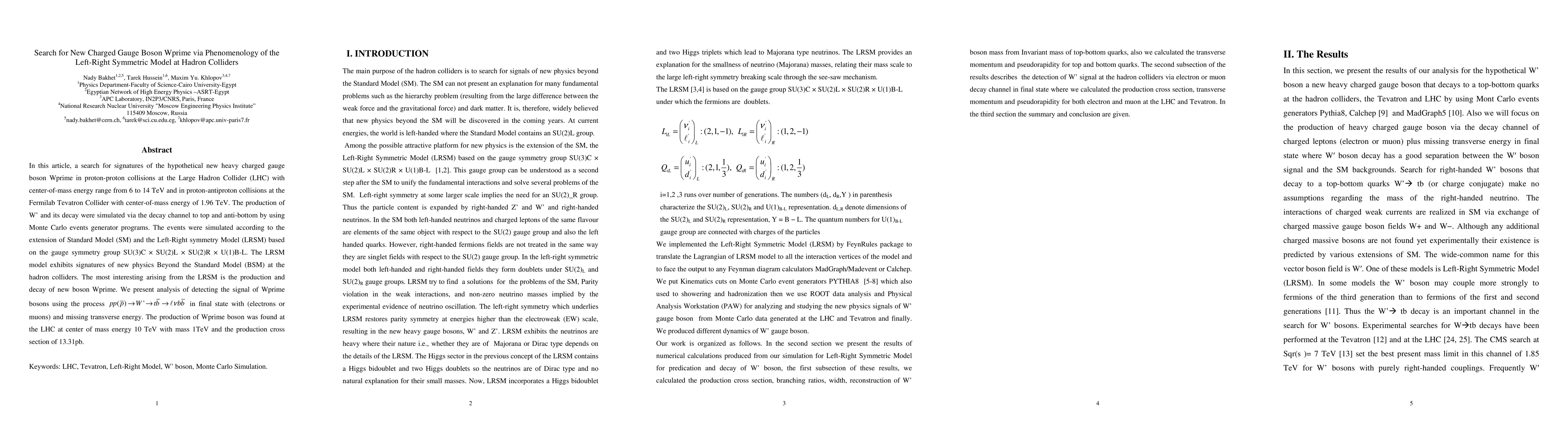 This paper investigates the phenomenology of the Left-Right Symmetric Model (LRSM) at hadron colliders to search for the new charged gauge boson $W'$. The study simulates $W'$ production and decay to top and anti-bottom quarks in proton-proton and proton-antiproton collisions at the LHC and Tevatron, respectively, finding potential evidence of $W'$ at 1 TeV mass with a production cross-section of 13.31 pb at the LHC.