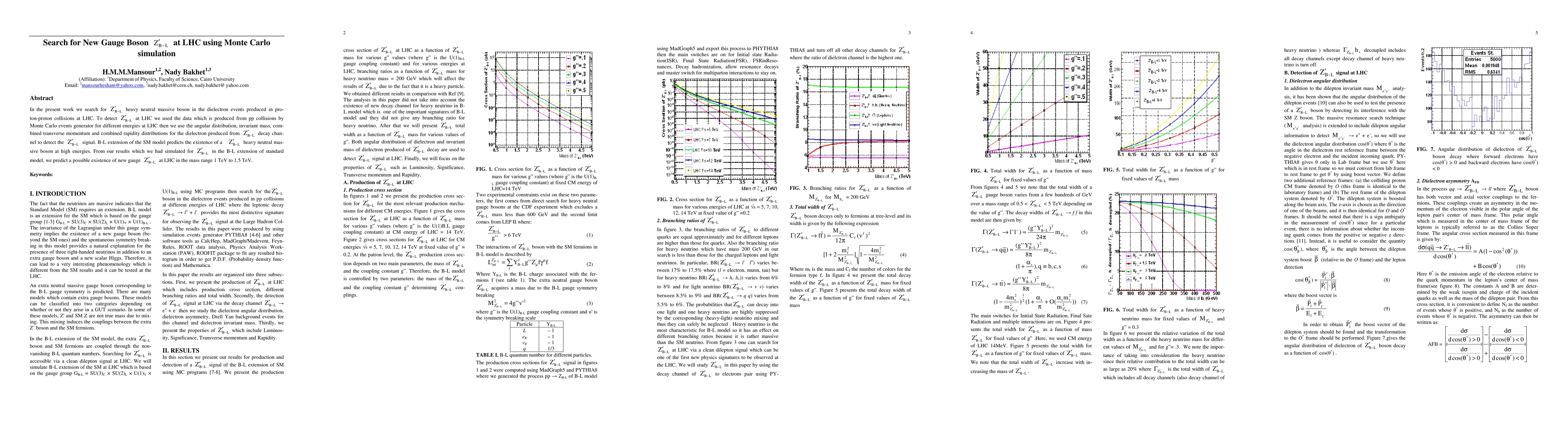 We search for Z'B-L heavy neutral massive boson in dielectron events produced in proton-proton collisions at LHC using Monte Carlo simulation programs. To detect Z'B-L at LHC we used the data which is produced from pp collision of Pythia8 produced events at different energies for LHC then we use the angular distribution, invariant mass, combined transverse momentum and combined rapidity distributions for the dielectron produced from Z'B-L decay channel to detect Z'B-L signal. B-L extension of SM model predicts by existing Z'B-L heavy neutral massive boson at high energies and from our results which we had simulated for Z'B-L in B-L extension of standard model we predict that Z'B-L boson will be found at LHC and has a mass in the range from 1000GeV to 1500GeV.