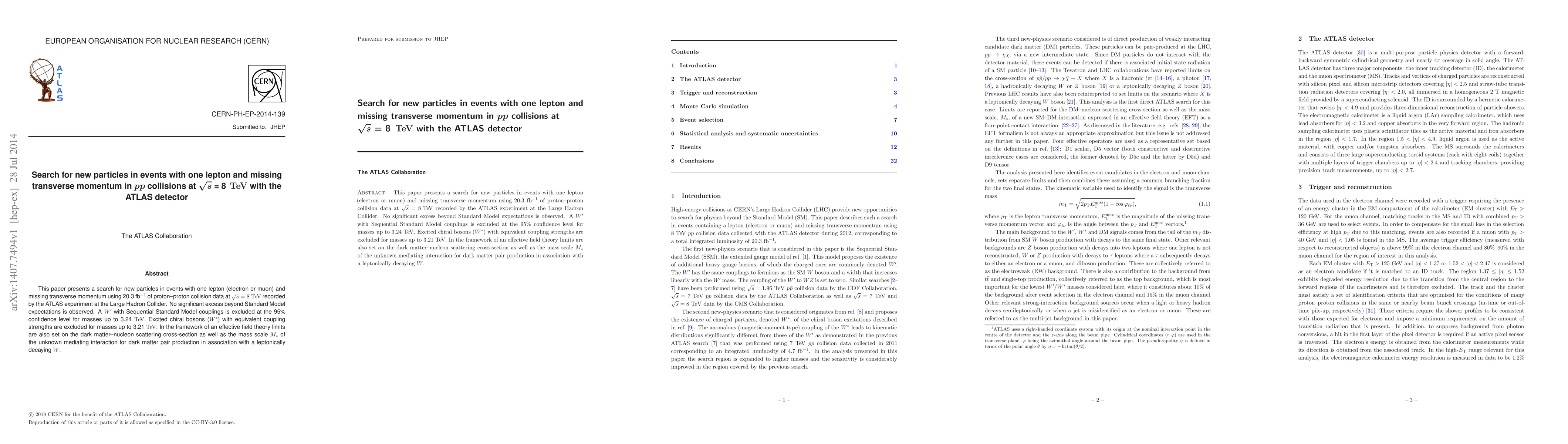 This paper investigates new particles in proton-proton collisions with one lepton and missing transverse momentum using ATLAS data at 8 TeV, finding no significant deviations from Standard Model predictions. It excludes $W'$ and excited chiral bosons up to 3.24 TeV and 3.21 TeV respectively, and sets limits on dark matter interactions.