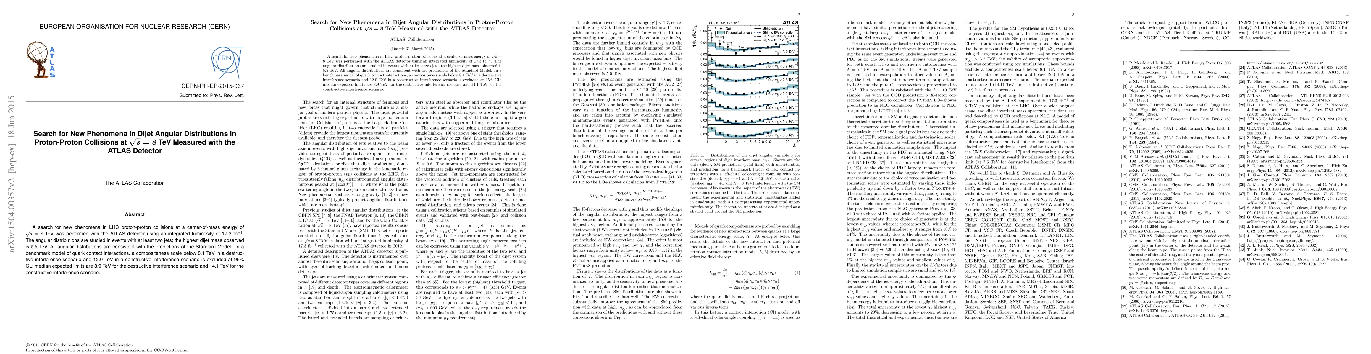 This paper investigates new phenomena in proton-proton collisions at $\sqrt{s}=8$ TeV using the ATLAS detector, focusing on dijet angular distributions. No deviations from Standard Model predictions were found, and limits on compositeness scales were established in a quark contact interaction model.