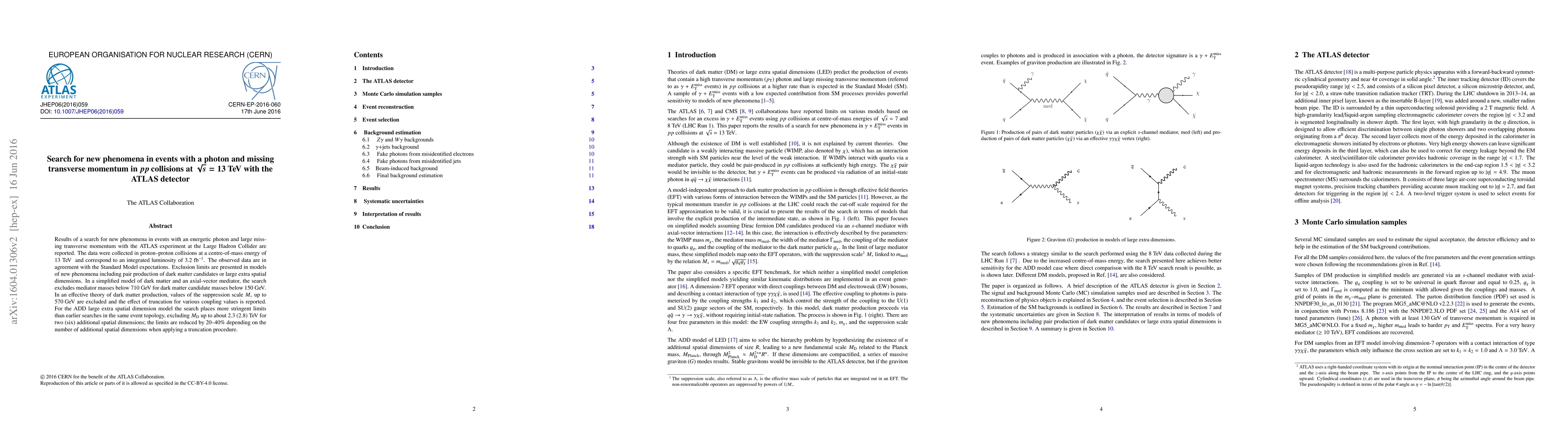 The ATLAS experiment searched for new phenomena in proton-proton collisions at 13 TeV, finding no deviations from Standard Model expectations, but setting limits on dark matter and extra spatial dimensions.