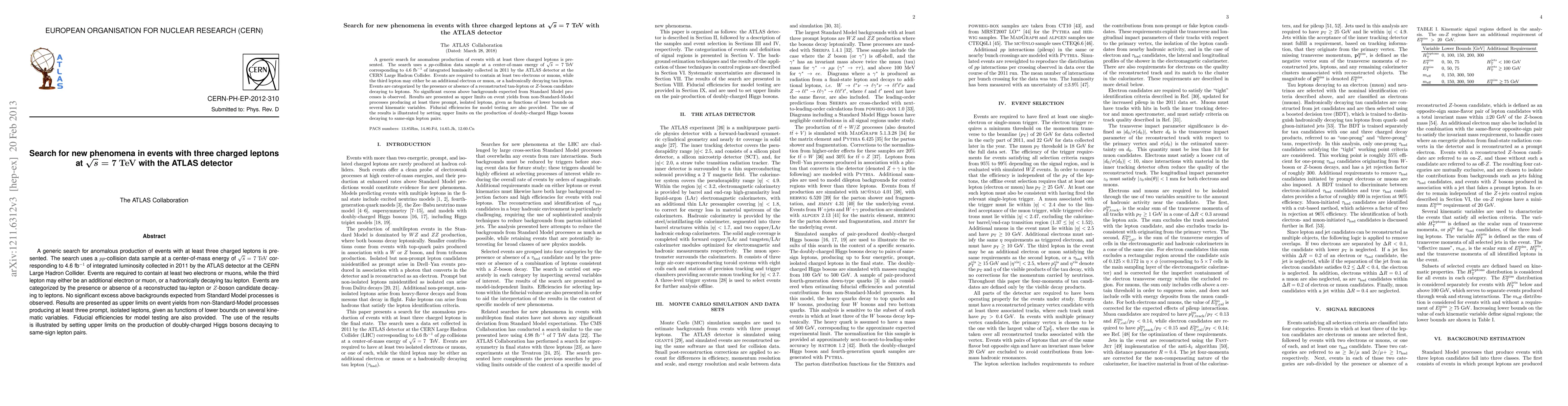 A generic search for anomalous production of events with at least three charged leptons is presented. The search uses a pp-collision data sample at a center-of-mass energy of 7 TeV corresponding to 4.6 inverse femtobarns of integrated luminosity collected in 2011 by the ATLAS detector at the CERN Large Hadron Collider. Events are required to contain at least two electrons or muons, while the third lepton may either be an additional electron or muon, or a hadronically decaying tau lepton. Events are categorized by the presence or absence of a reconstructed tau-lepton or Z-boson candidate decaying to leptons. No significant excess above backgrounds expected from Standard Model processes is observed. Results are presented as upper limits on event yields from non-Standard-Model processes producing at least three prompt, isolated leptons, given as functions of lower bounds on several kinematic variables. Fiducial efficiencies for model testing are also provided. The use of the results is illustrated by setting upper limits on the production of doubly-charged Higgs bosons decaying to same-sign lepton pairs.