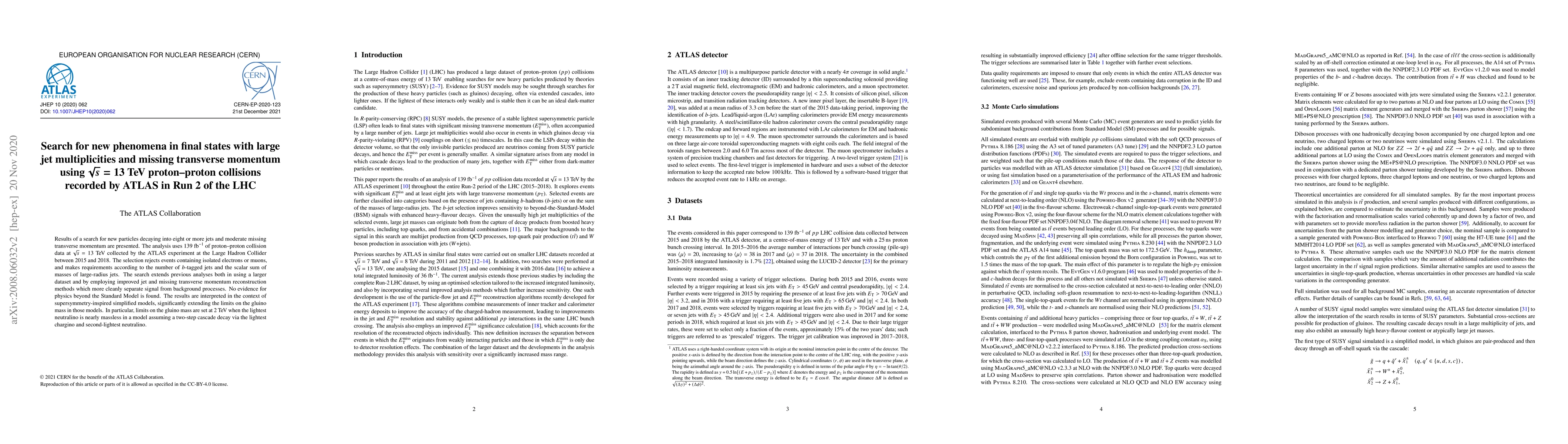 Results of a search for new particles decaying into eight or more jets and moderate missing transverse momentum are presented. The analysis uses 139 fb$^{-1}$ of proton$-$proton collision data at $\sqrt{s} = 13$ TeV collected by the ATLAS experiment at the Large Hadron Collider between 2015 and 2018. The selection rejects events containing isolated electrons or muons, and makes requirements according to the number of $b$-tagged jets and the scalar sum of masses of large-radius jets. The search extends previous analyses both in using a larger dataset and by employing improved jet and missing transverse momentum reconstruction methods which more cleanly separate signal from background processes. No evidence for physics beyond the Standard Model is found. The results are interpreted in the context of supersymmetry-inspired simplified models, significantly extending the limits on the gluino mass in those models. In particular, limits on the gluino mass are set at 2 TeV when the lightest neutralino is nearly massless in a model assuming a two-step cascade decay via the lightest chargino and second-lightest neutralino.