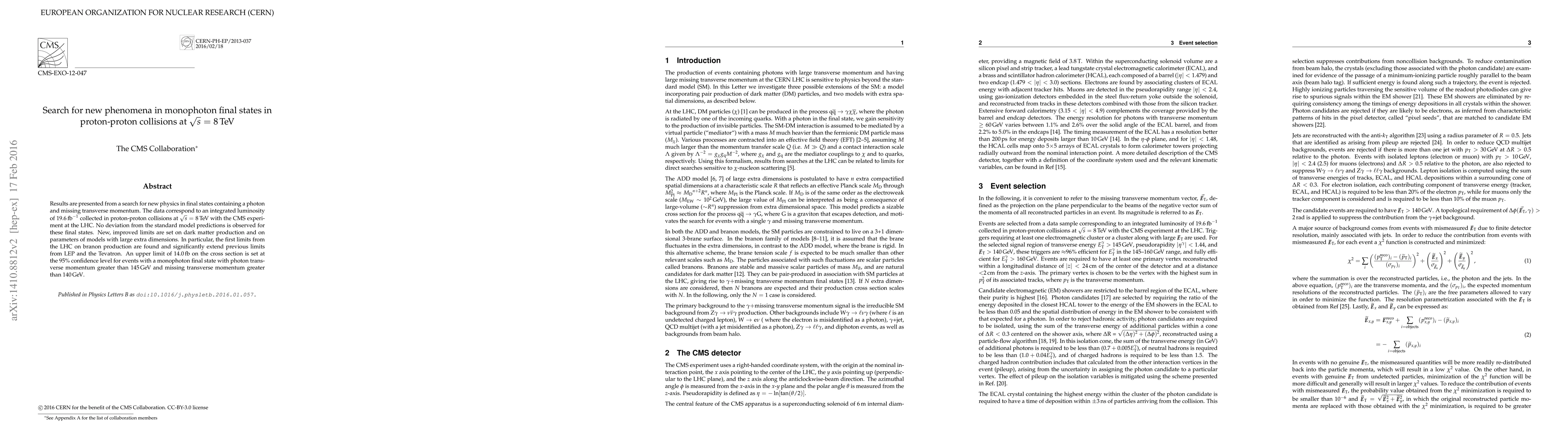 This paper reports a search for new physics in proton-proton collisions at 8 TeV, focusing on monophoton final states with missing transverse momentum, using the CMS experiment at the LHC. No deviations from the Standard Model were observed, but new limits on dark matter and branon production were established.
