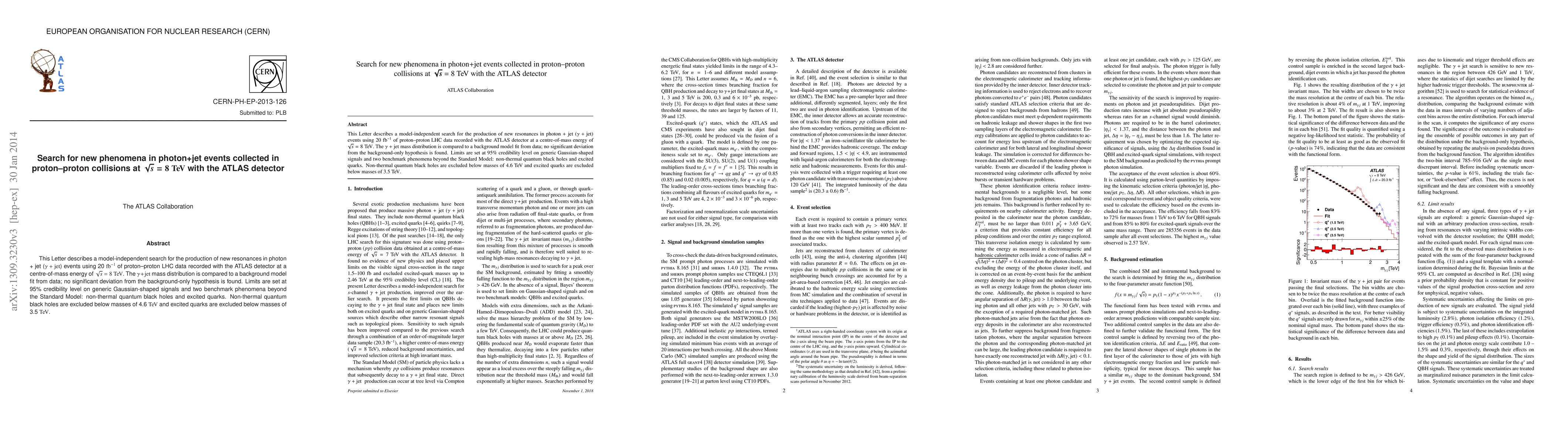 This Letter describes a model-independent search for the production of new resonances in photon + jet events using 20 inverse fb of proton--proton LHC data recorded with the ATLAS detector at a centre-of-mass energy of sqrt(s) = 8 TeV. The photon + jet mass distribution is compared to a background model fit from data; no significant deviation from the background-only hypothesis is found. Limits are set at 95% credibility level on generic Gaussian-shaped signals and two benchmark phenomena beyond the Standard Model: non-thermal quantum black holes and excited quarks. Non-thermal quantum black holes are excluded below masses of 4.6 TeV and excited quarks are excluded below masses of 3.5 TeV.