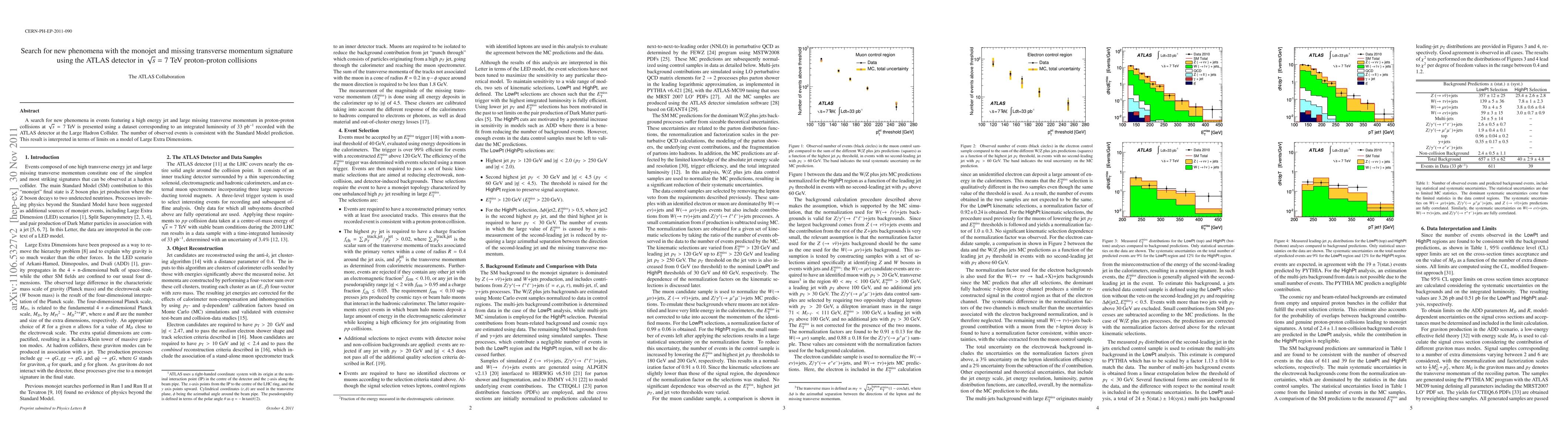 This paper reports a search for new physics using the ATLAS detector at the LHC, focusing on events with high-energy jets and significant missing transverse momentum at 7 TeV. The observed data aligns with Standard Model predictions, leading to new constraints on models proposing Large Extra Dimensions.