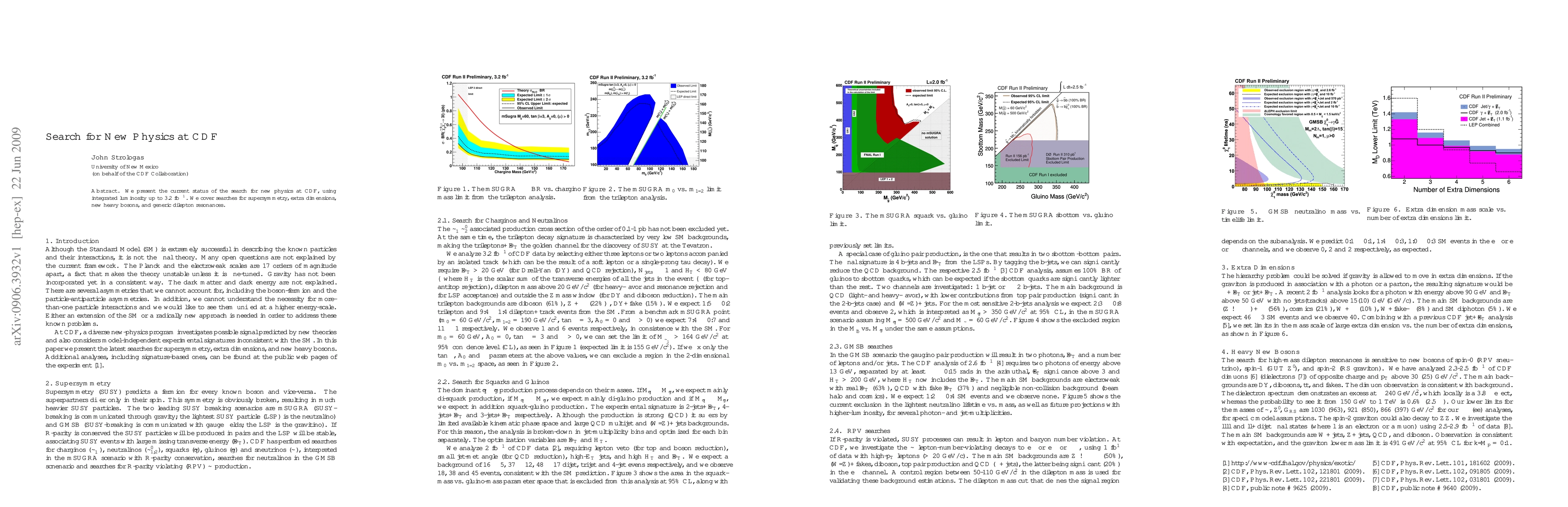 Summary: This paper reviews the CDF experiment's efforts to find new physics using up to 3.2 fb-1 of integrated luminosity, focusing on searches for supersymmetry, extra dimensions, new heavy bosons, and generic dilepton resonances. No significant deviations from the Standard Model were observed.