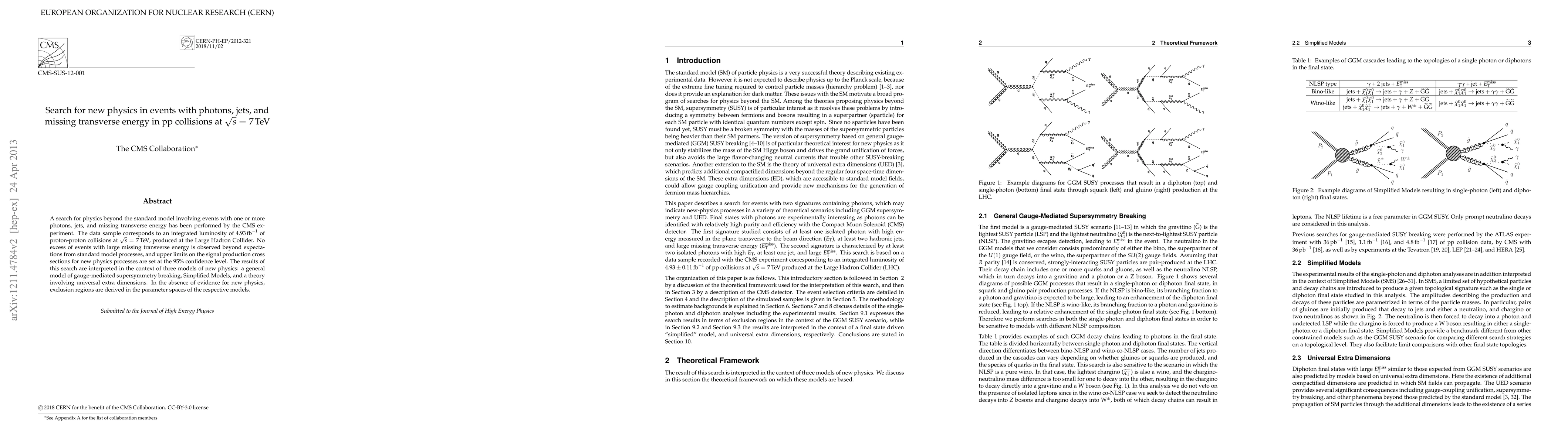 This CMS experiment investigates potential new physics beyond the standard model in proton-proton collisions at 7 TeV, focusing on events with photons, jets, and missing transverse energy. No significant deviations from standard model predictions were found, leading to upper limits on new physics cross sections and exclusion regions in several theoretical models.
