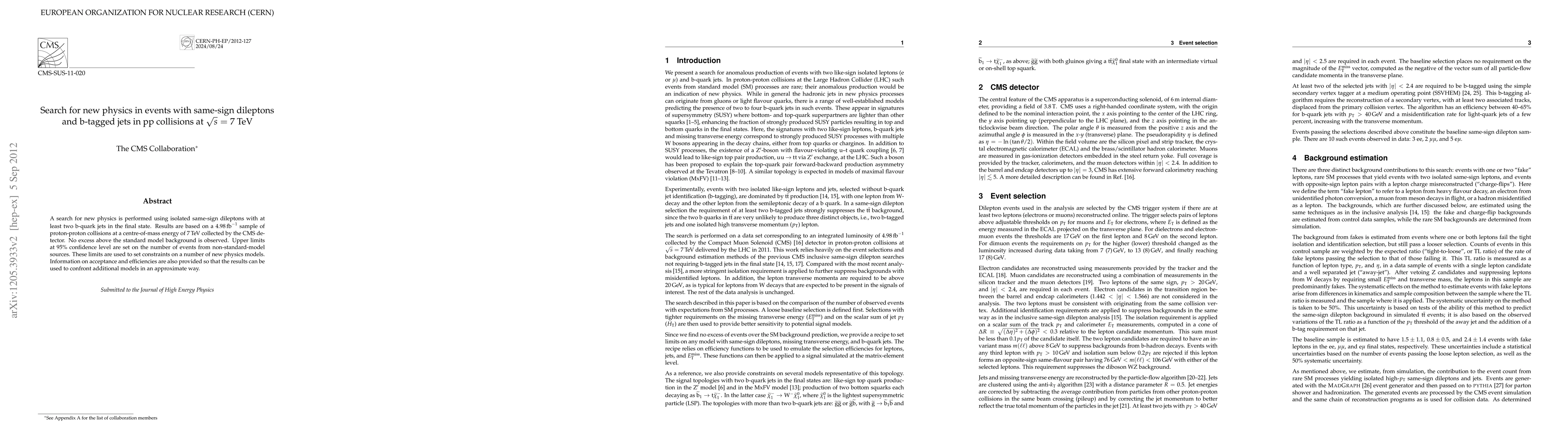 This paper reports a search for new physics in proton-proton collisions at 7 TeV using the CMS detector, focusing on events with same-sign dileptons and at least two b-quark jets. No significant excess beyond standard model predictions is observed, leading to new constraints on various new physics models.