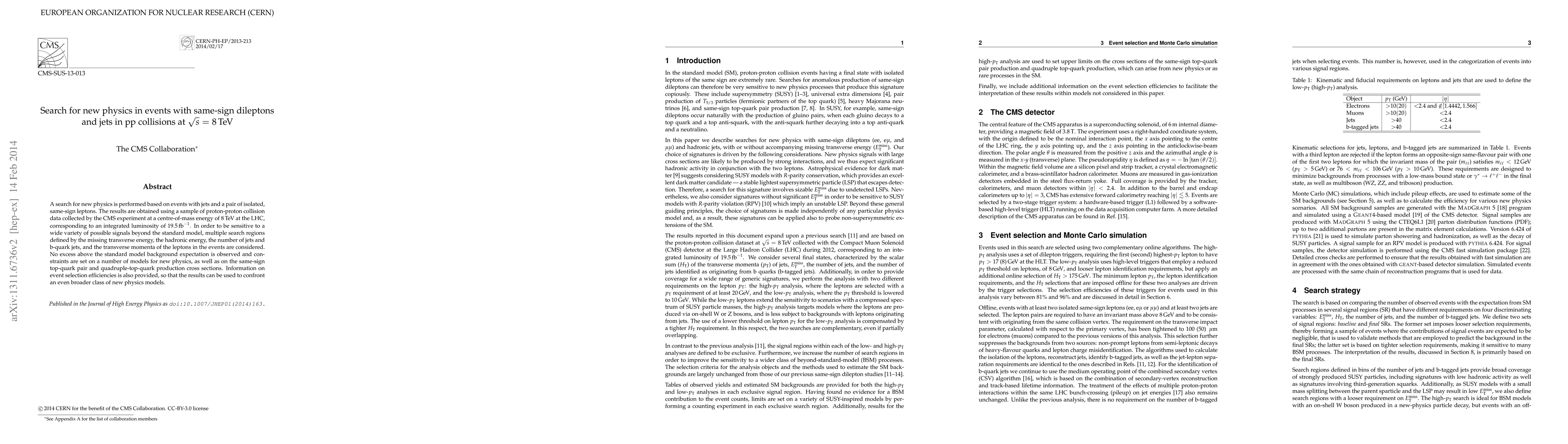 This paper reports a search for new physics in proton-proton collisions at 8 TeV using CMS data, focusing on events with same-sign dileptons and jets. No significant excess is observed, but constraints are set on various new physics models, including top-quark pair and quadruple-top-quark production.