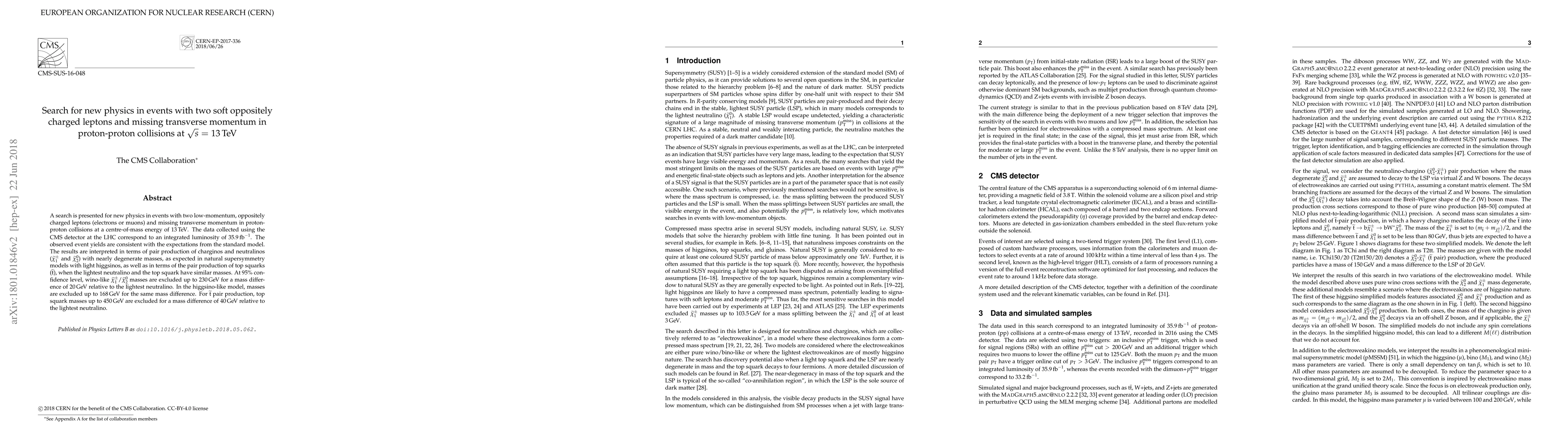 This paper investigates new physics in proton-proton collisions at 13 TeV with two low-momentum, oppositely charged leptons and missing transverse momentum using the CMS detector. No deviations from the standard model were found, leading to exclusion limits for chargino and neutralino masses up to 230 GeV and top squark masses up to 450 GeV.