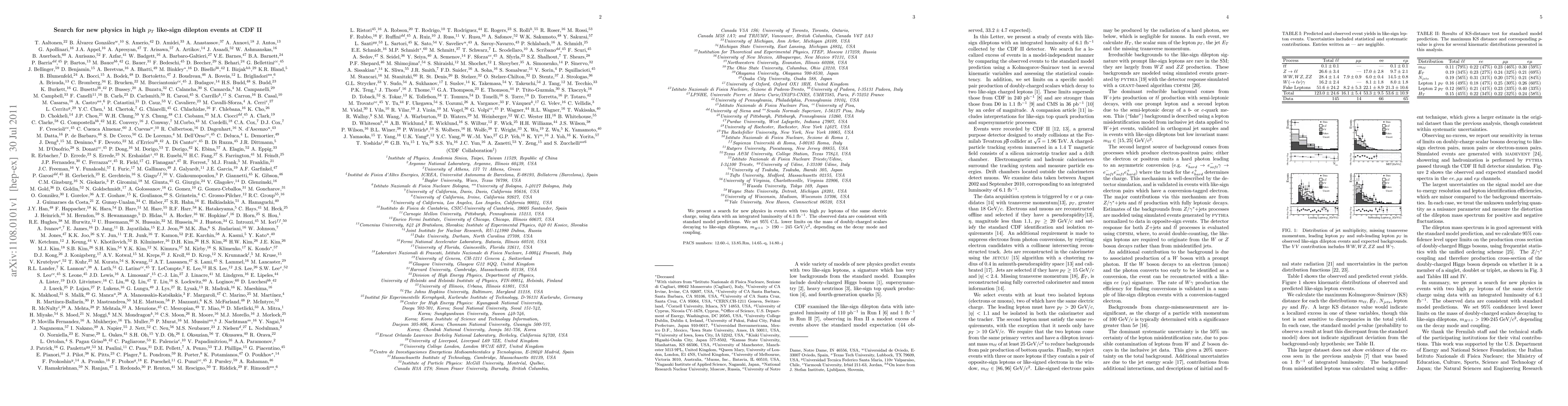 We present a search for new physics in events with two high $p_T$ leptons of the same electric charge, using data with an integrated luminosity of 6.1 fb$^{-1}$. The observed data are consistent with standard model predictions. We set 95% C.L. lower limits on the mass of doubly-charged scalars decaying to like-sign dileptons, $m_{H^{\pm\pm}}> 190-245$ GeV/$c^2$, depending on the decay mode and coupling.