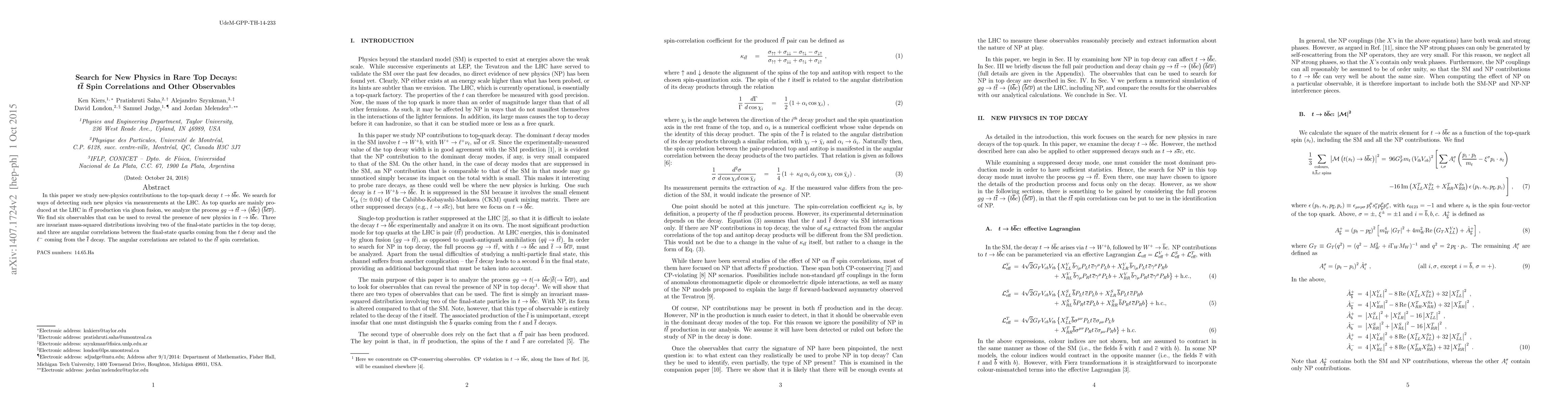 In this paper we study new-physics contributions to the top-quark decay $t \to b \bar b c$. We search for ways of detecting such new physics via measurements at the LHC. As top quarks are mainly produced at the LHC in $t \bar t$ production via gluon fusion, we analyze the process $gg \to t \bar t \to (b \bar b c) (\bar b \ell \bar \nu)$. We find six observables that can be used to reveal the presence of new physics in $t \to b \bar b c$. Three are invariant mass-squared distributions involving two of the final-state particles in the top decay, and three are angular correlations between the final-state quarks coming from the $t$ decay and the $\ell^-$ coming from the $\bar t$ decay. The angular correlations are related to the $t \bar t$ spin correlation.