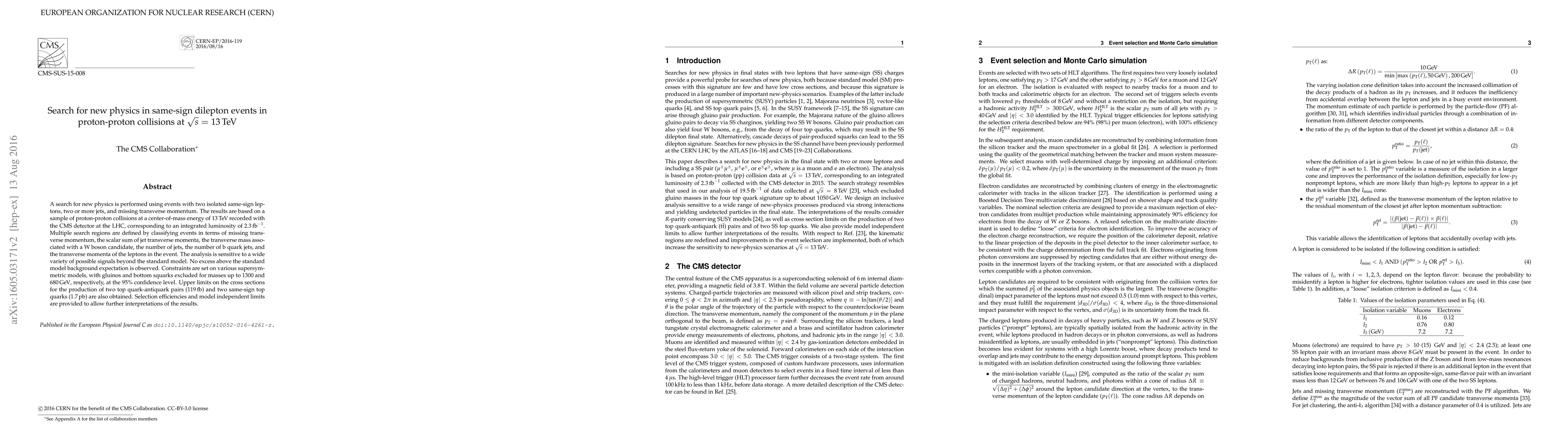 A search for new physics is performed using events with two isolated same-sign leptons, two or more jets, and missing transverse momentum. The results are based on a sample of proton-proton collisions at a center-of-mass energy of 13 TeV recorded with the CMS detector at the LHC, corresponding to an integrated luminosity of 2.3 inverse femtobarns. Multiple search regions are defined by classifying events in terms of missing transverse momentum, the scalar sum of jet transverse momenta, the transverse mass associated with a W boson candidate, the number of jets, the number of b quark jets, and the transverse momenta of the leptons in the event. The analysis is sensitive to a wide variety of possible signals beyond the standard model. No excess above the standard model background expectation is observed. Constraints are set on various supersymmetric models, with gluinos and bottom squarks excluded for masses up to 1300 and 680 GeV, respectively, at the 95% confidence level. Upper limits on the cross sections for the production of two top quark-antiquark pairs (119 fb) and two same-sign top quarks (1.7 pb) are also obtained. Selection efficiencies and model independent limits are provided to allow further interpretations of the results.