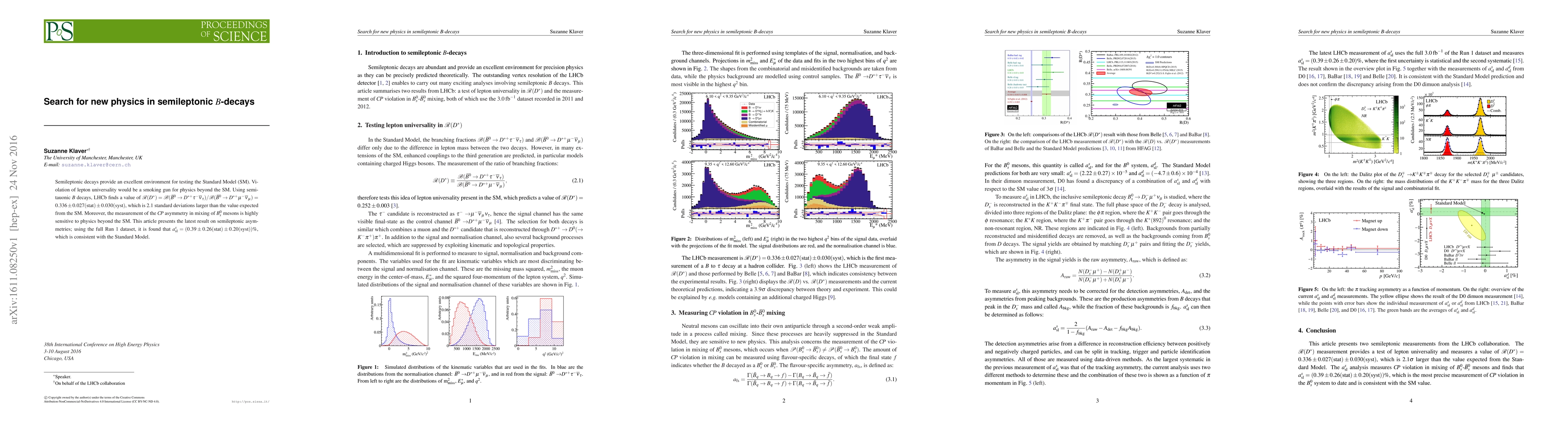 New results from LHCb confirm that semileptonic B-decays show a 2.1-standard-deviation deviation from the Standard Model, hinting at physics beyond it, while measuring of CP asymmetry in B_s^0 mesons is consistent with the SM.