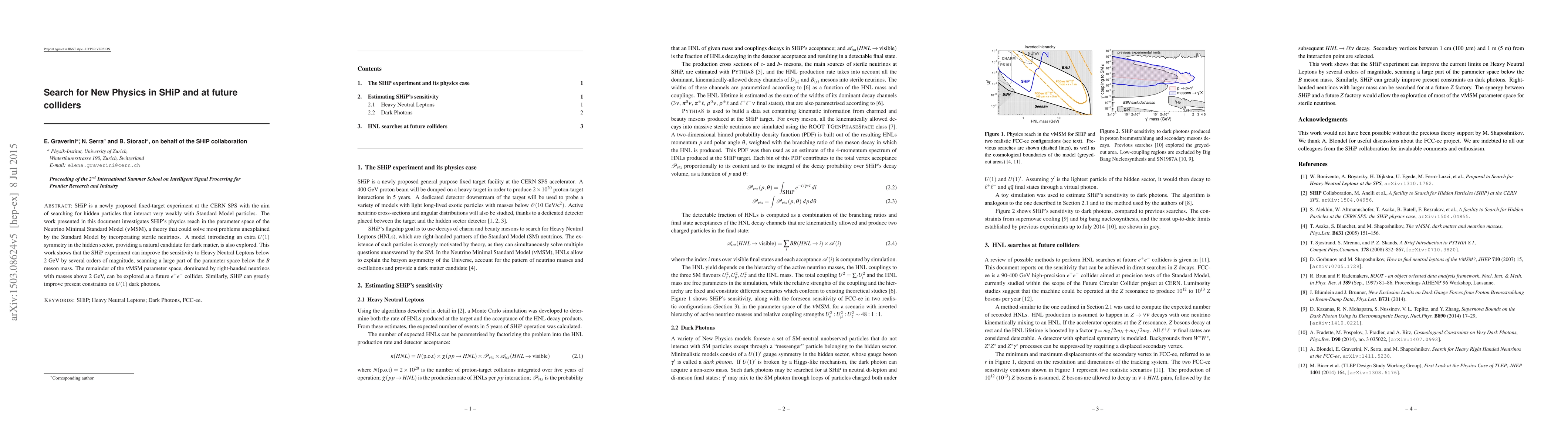 This paper explores SHiP's potential to discover hidden particles, particularly focusing on the $\nu$MSM model and $U(1)$ dark photons. It demonstrates that SHiP can significantly enhance sensitivity to Heavy Neutral Leptons below 2 GeV, while future $e^+e^-$ colliders may probe the higher mass range.