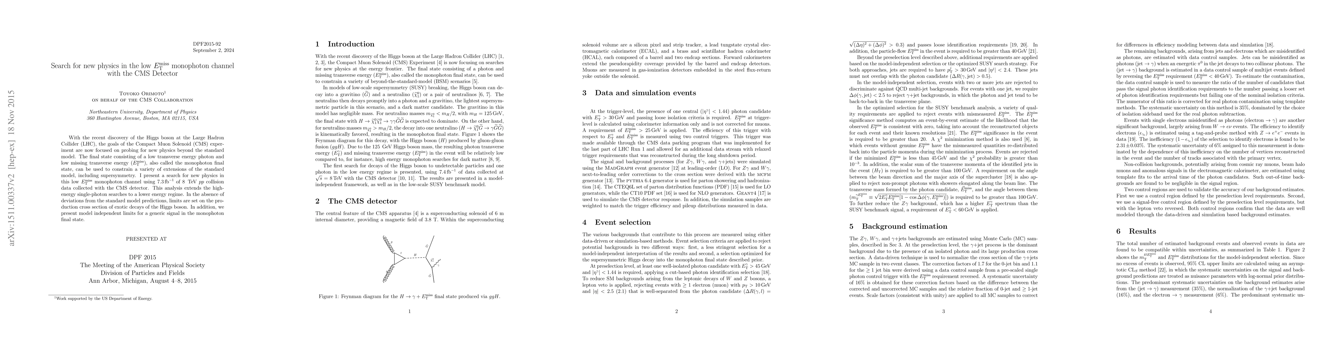 With the recent discovery of the Higgs boson at the Large Hadron Collider (LHC), the goals of the Compact Muon Solenoid (CMS) experiment are now focused on probing for new physics beyond the standard model. The final state consisting of a low transverse energy photon and low missing transverse energy (MET), also called the monophoton final state, can be used to constrain a variety of extensions of the standard model, including supersymmetry. I present a search for new physics in this low MET monophoton channel using 7.3/fb of 8 TeV pp collision data collected with the CMS detector. This analysis extends the high-energy single-photon searches to a lower energy regime. In the absence of deviations from the standard model predictions, limits are set on the production cross section of exotic decays of the Higgs boson. In addition, we present model independent limits for a generic signal in the monophoton final state.