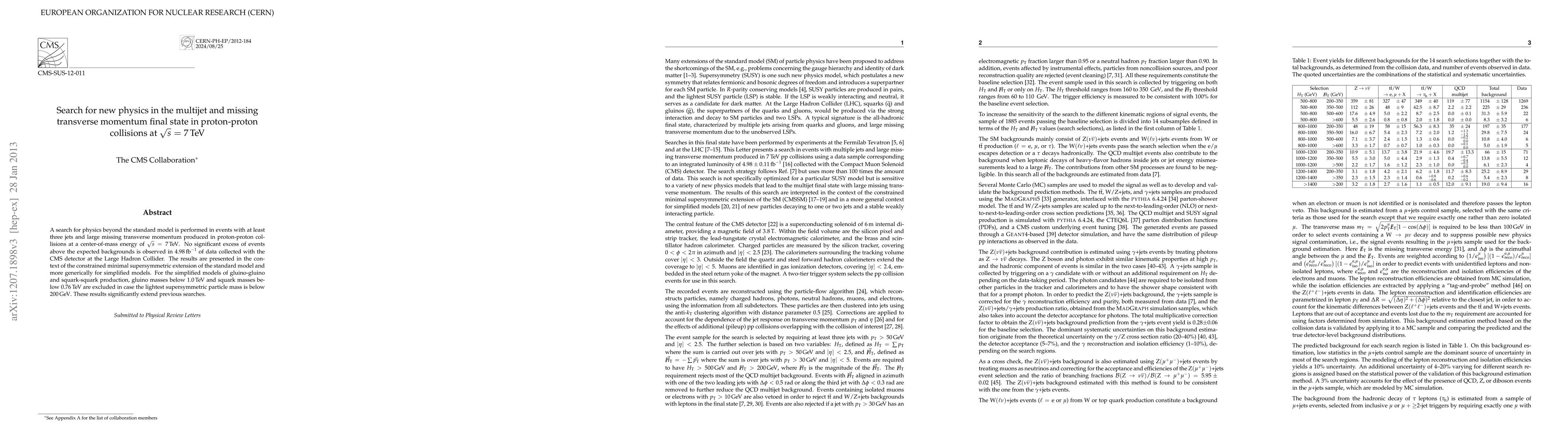 A search for physics beyond the standard model is performed in events with at least three jets and large missing transverse momentum produced in proton-proton collisions at sqrt(s) = 7 TeV. No significant excess of events above the expected backgrounds is observed in 4.98 inverse femtobarns of data collected with the CMS detector at the Large Hadron Collider. The results are presented in the context of the constrained minimal supersymmetric extension of the standard model and more generically for simplified models. For the simplified models of gluino-gluino and squark-squark production, gluino masses below 1.0 TeV and squark masses below 0.76 TeV are excluded in case the lightest supersymmetric particle mass is below 200 GeV. These results significantly extend previous searches.
