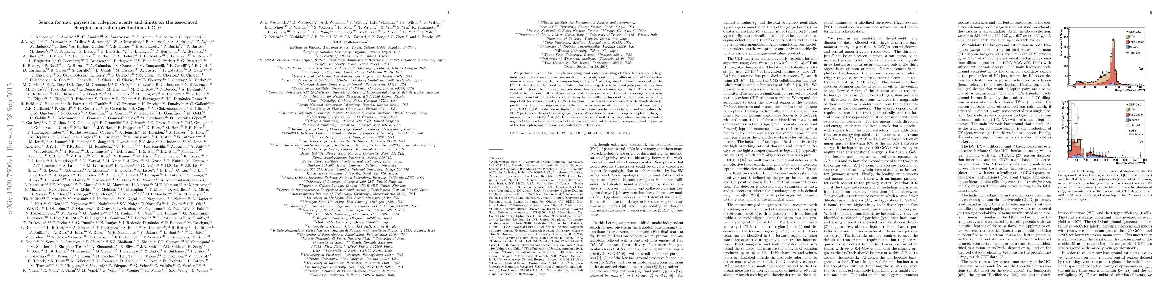 We perform a search for new physics using final states consisting of three leptons and a large imbalance in transverse momentum resulting from proton-antiproton collisions at 1.96 TeV center-of-mass energy. We use data corresponding to 5.8 fb-1 of integrated luminosity recorded by the CDF II detector at the Tevatron collider. Our main objective is to investigate possible new low-momentum (down to 5 GeV/c) multi-leptonic final states not investigated by LHC experiments. Relative to previous CDF analyses, we expand the geometric and kinematic coverage of electrons and muons and utilize tau leptons that decay hadronically. Inclusion of tau leptons is particularly important for supersymmetry (SUSY) searches. The results are consistent with standard-model predictions. By optimizing our event selection to increase sensitivity to the minimal supergravity (mSUGRA) SUSY model, we set limits on the associated production of chargino and neutralino, the SUSY partners of the electroweak gauge bosons. We exclude cross sections up to 0.1 pb and chargino masses up to 168 GeV/c^2 at 95% CL, for a suited set of mSUGRA parameters. We also exclude a region of the two-dimensional space of the masses of the neutralino and the supersymmetric partner of the tau lepton, not previously excluded at the Tevatron.