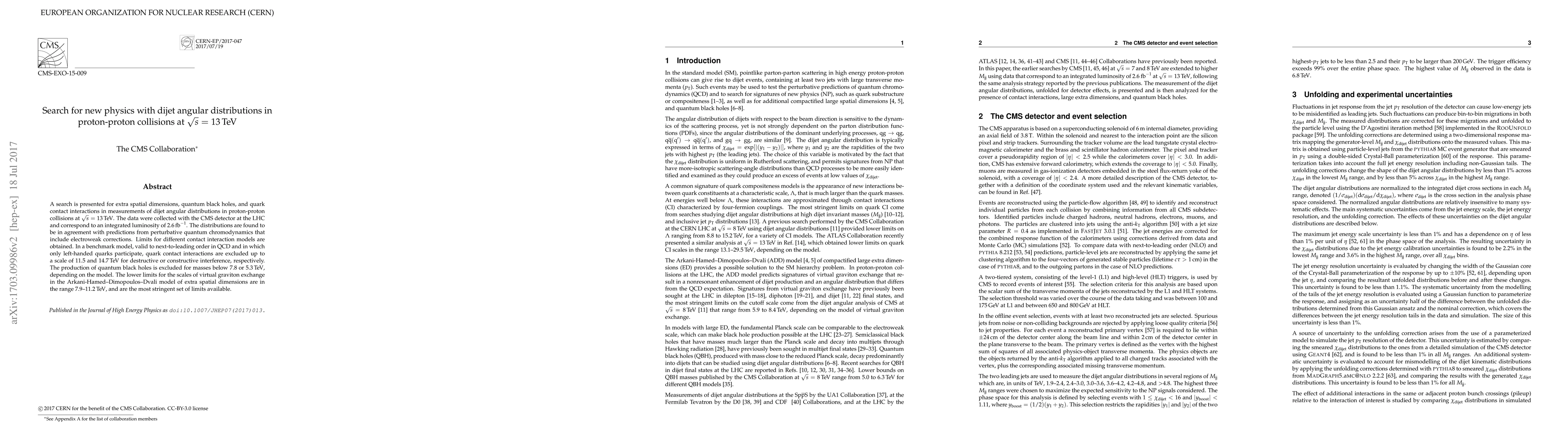 A search is presented for extra spatial dimensions, quantum black holes, and quark contact interactions in measurements of dijet angular distributions in proton-proton collisions at sqrt(s) = 13 TeV. The data were collected with the CMS detector at the LHC and correspond to an integrated luminosity of 2.6 inverse femtobarns. The distributions are found to be in agreement with predictions from perturbative quantum chromodynamics that include electroweak corrections. Limits for different contact interaction models are obtained in a benchmark model, valid to next-to-leading order in QCD, in which only left-handed quarks participate, quark contact interactions are excluded up to a scale of 11.5 or 14.7 TeV for destructive or constructive interference, respectively. The production of quantum black holes is excluded for masses below 7.8 or 5.3 TeV, depending on the model. The lower limits for the scales of virtual graviton exchange in the Arkani-Hamed--Dimopoulos--Dvali model of extra spatial dimensions are in the range 7.9-11.2 TeV, and are the most stringent set of limits available.