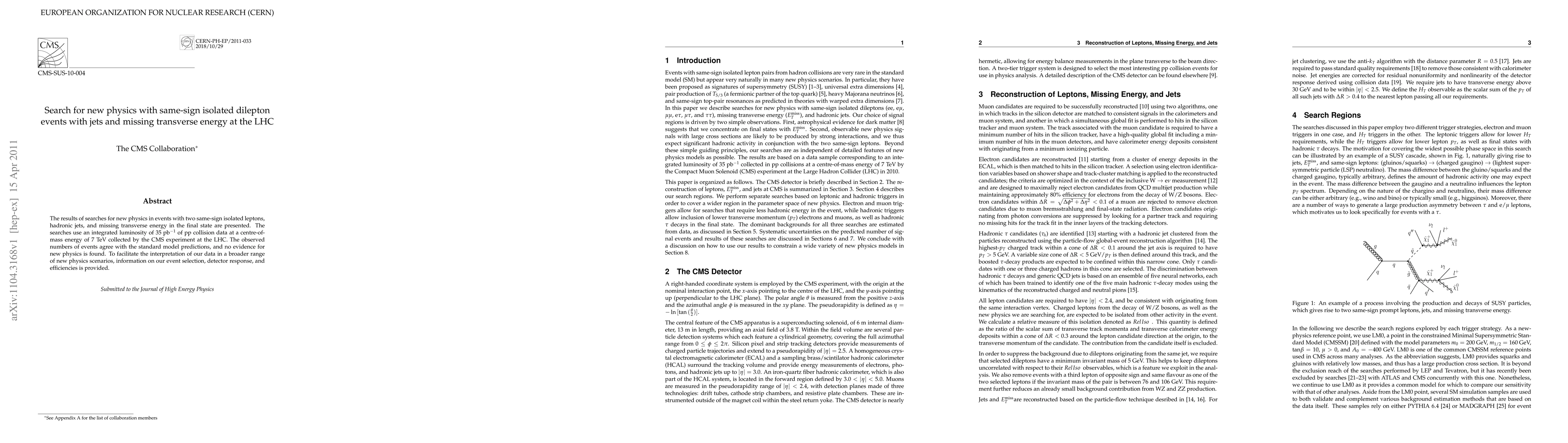 This paper reports on searches for new physics using same-sign dilepton events with jets and missing transverse energy at the LHC, finding no deviations from standard model predictions. Detailed information on event selection and detector efficiencies is provided to aid broader interpretations of the results.