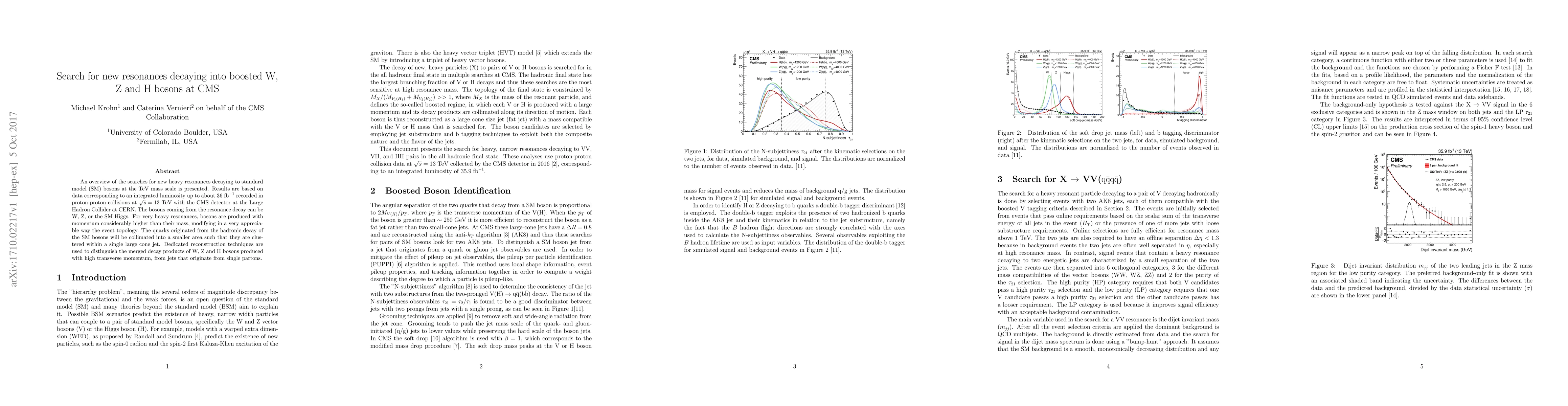 An overview of the searches for new heavy resonances decaying to standard model (SM) bosons at the TeV mass scale is presented. Results are based on data corresponding to an integrated luminosity up to about $36\; \mathrm{fb}^{-1}$ recorded in proton-proton collisions at $\sqrt{s}=13$ TeV with the CMS detector at the Large Hadron Collider at CERN. The bosons coming from the resonance decay can be W, Z, or the SM Higgs. For very heavy resonances, bosons are produced with momentum considerably higher than their mass, modifying in a very appreciable way the event topology. The quarks originated from the hadronic decay of the SM bosons will be collimated into a smaller area such that they are clustered within a single large cone jet. Dedicated reconstruction techniques are used to distinguish the merged decay products of W, Z and H bosons produced with high transverse momentum, from jets that originate from single partons.