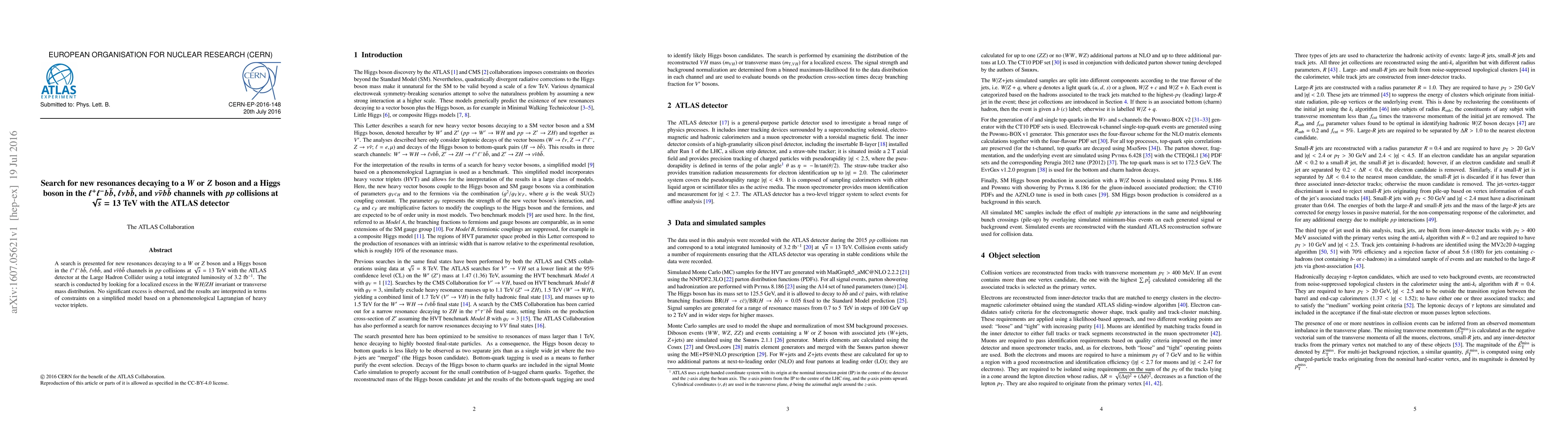 This paper explores new resonances decaying into a $W$ or $Z$ boson and a Higgs boson using the ATLAS detector at the LHC, analyzing $pp$ collisions at 13 TeV. No significant excess is observed, leading to constraints on a simplified model of heavy vector triplets.