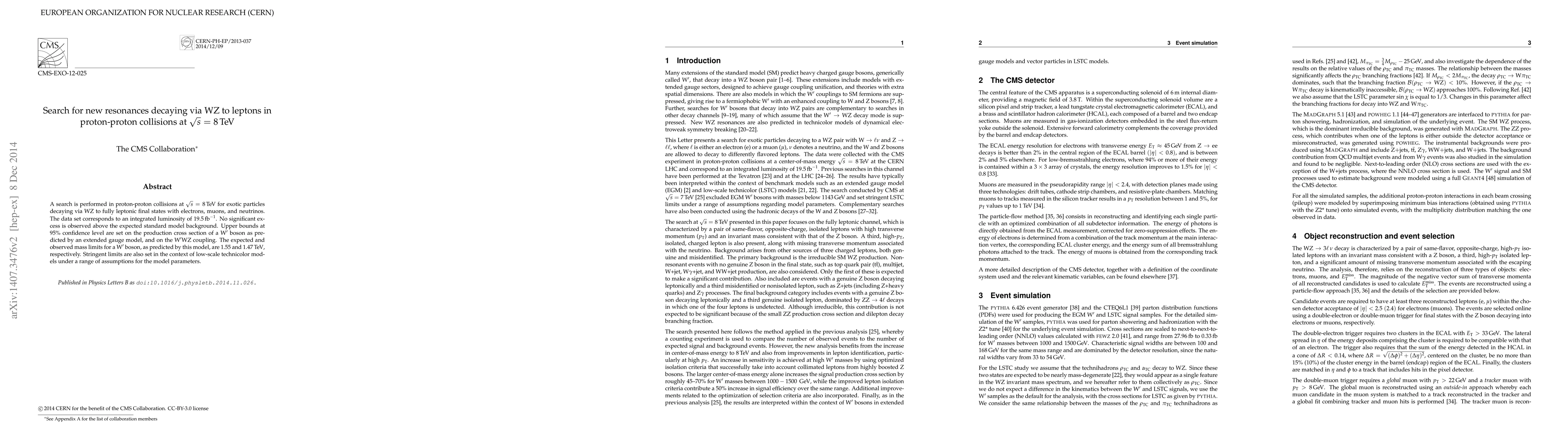 This paper investigates proton-proton collisions at 8 TeV for new resonances decaying into WZ leptons, finding no significant excess over standard model predictions. It sets stringent upper limits on the production cross section of W' bosons and W'WZ coupling, with observed mass limits of 1.47 TeV.