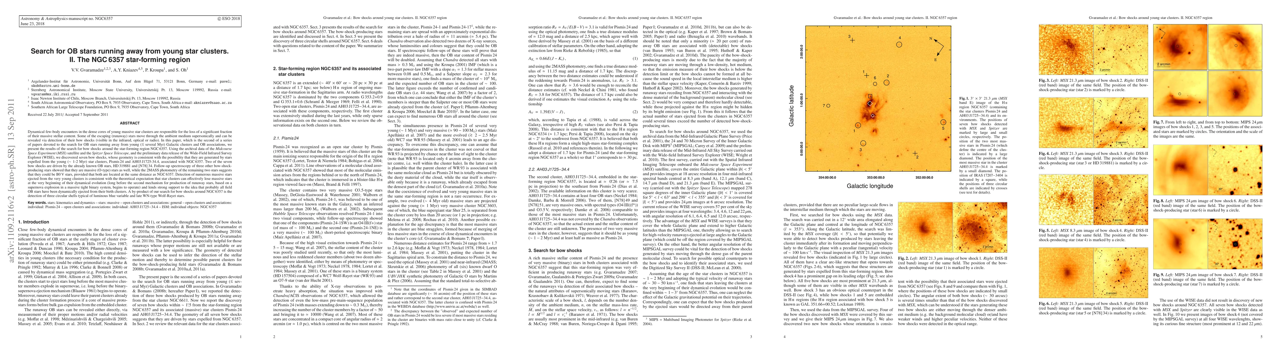 This study used infrared data to find seven bow shocks indicating that several massive stars have been ejected from the young star clusters in the NGC 6357 region, supporting the idea that many field OB stars originate from their birth clusters. Additionally, the search revealed three shells likely associated with evolved massive stars like luminous blue variables or Wolf-Rayet stars.