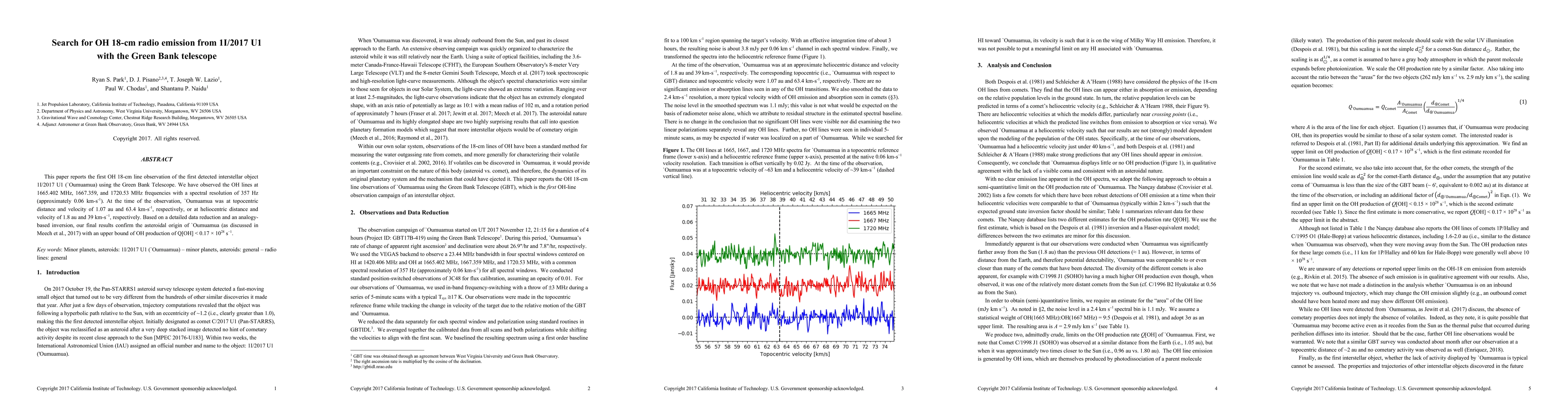 This paper reports the first OH 18-cm line observation of the first detected interstellar object 1I/2017 U1 (`Oumuamua) using the Green Bank Telescope. We have observed the OH lines at 1665.402 MHz, 1667.359, and 1720.53 MHz frequencies with a spectral resolution of 357 Hz (approximately 0.06 km-s^{-1}). At the time of the observation, `Oumuamua was at topocentric distance and velocity of 1.07 au and 63.4 km-s^{-1}, respectively, or at heliocentric distance and velocity of 1.8 au and 39 km-s^{-1}, respectively. Based on a detailed data reduction and an analogy-based inversion, our final results confirm the asteroidal origin of `Oumuamua (as discussed in Meech et al., 2017) with an upper bound of OH production of Q[OH] < 0.17 x 10^{28} s^{-1}.