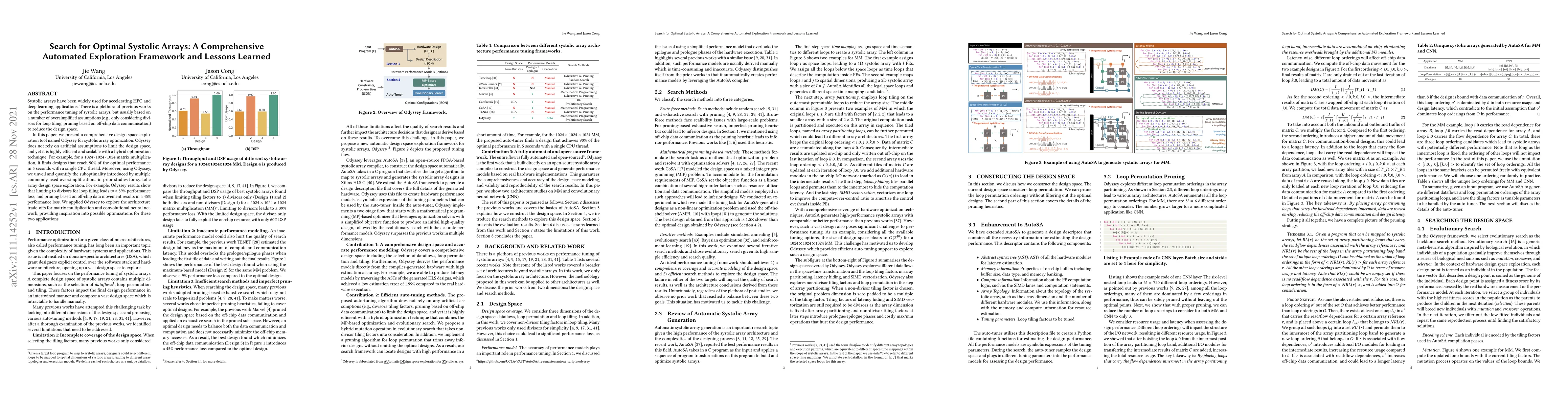 Systolic arrays have been widely used for accelerating HPC and deep learning applications. There is a plethora of previous works on the performance tuning of systolic arrays, but usually based on a number of oversimplified assumptions (e.g., only considering divisors for loop tiling, pruning based on off-chip data communication) to reduce the design space. In this paper, we present a comprehensive design space exploration tool named Odyssey for systolic array optimization. Odyssey does not rely on artificial assumptions to limit the design space, and yet it is highly efficient and scalable with a hybrid optimization technique. For example, for a 1024x1024x1024 matrix multiplication, it finds designs that reach 90% of the optimal performance in 5 seconds with a single CPU thread. Moreover, using Odyssey, we unveil and quantify the suboptimality introduced by multiple commonly used oversimplifications in prior studies for systolic array design space exploration. For example, Odyssey results show that limiting to divisors for loop tiling leads to a 39% performance loss, and pruning based on off-chip data movement results in a 45% performance loss. We applied Odyssey to explore the architecture trade-offs for matrix multiplication and convolutional neural network, providing inspiration into possible optimizations for these two applications.