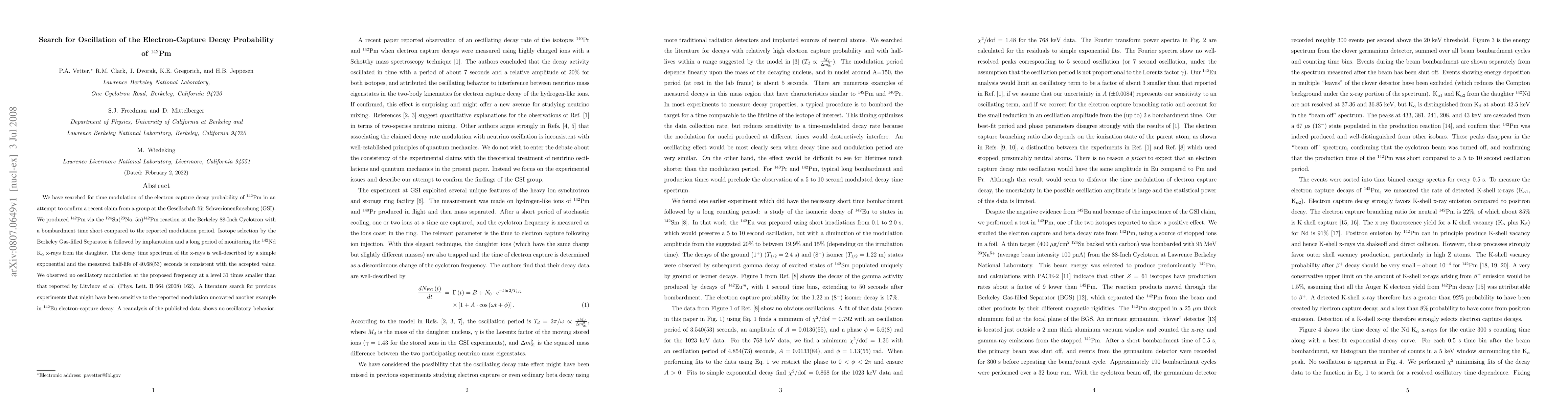 We have searched for time modulation of the electron capture decay probability of $^{142}$Pm in an attempt to confirm a recent claim from a group at the Gesellschaft f\"{u}r Schwerionenforschung (GSI). We produced $^{142}$Pm via the $^{124}$Sn($^{23}$Na, 5n)$^{142}$Pm reaction at the Berkeley 88-Inch Cyclotron with a bombardment time short compared to the reported modulation period. Isotope selection by the Berkeley Gas-filled Separator is followed by implantation and a long period of monitoring the $^{142}$Nd K$_{\alpha}$ x-rays from the daughter. The decay time spectrum of the x-rays is well-described by a simple exponential and the measured half-life of 40.68(53) seconds is consistent with the accepted value. We observed no oscillatory modulation at the proposed frequency at a level 31 times smaller than that reported by Litvinov {\it et al.} (Phys. Lett. B 664 (2008) 162; arXiv:0801.2079 [nucl-ex]). A literature search for previous experiments that might have been sensitive to the reported modulation uncovered another example in $^{142}$Eu electron-capture decay. A reanalysis of the published data shows no oscillatory behavior.