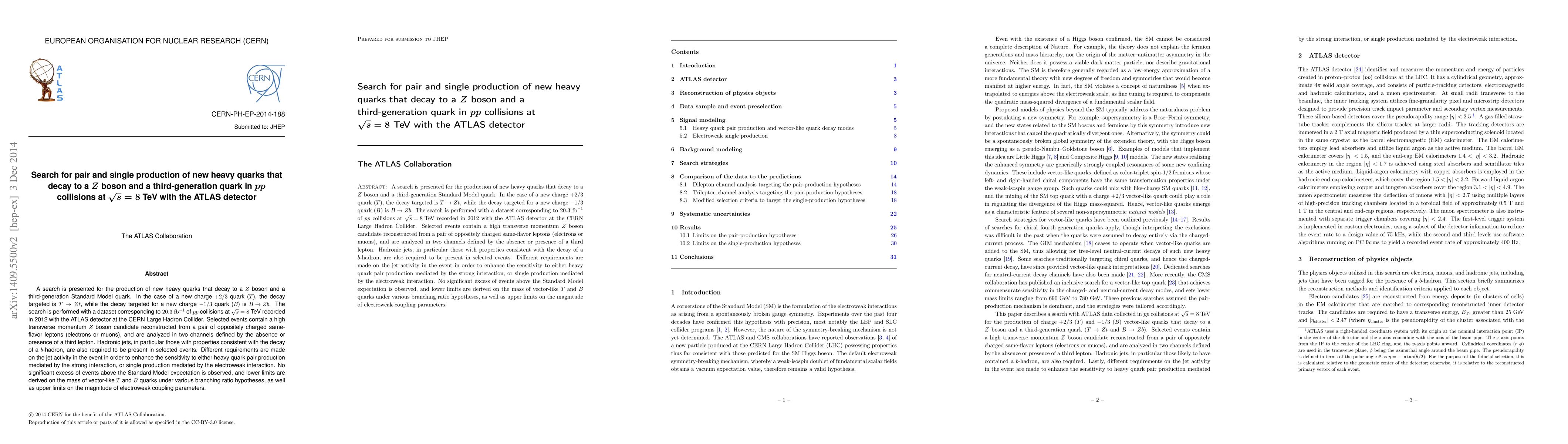 A search is presented for the production of new heavy quarks that decay to a $Z$ boson and a third-generation Standard Model quark. In the case of a new charge +2/3 quark ($T$), the decay targeted is $T \rightarrow Zt$, while the decay targeted for a new charge -1/3 quark ($B$) is $B \rightarrow Zb$. The search is performed with a dataset corresponding to 20.3 fb$^{-1}$ of $pp$ collisions at $\sqrt{s}=8$ TeV recorded in 2012 with the ATLAS detector at the CERN Large Hadron Collider. Selected events contain a high transverse momentum $Z$ boson candidate reconstructed from a pair of oppositely charged same-flavor leptons (electrons or muons), and are analyzed in two channels defined by the absence or presence of a third lepton. Hadronic jets, in particular those with properties consistent with the decay of a $b$-hadron, are also required to be present in selected events. Different requirements are made on the jet activity in the event in order to enhance the sensitivity to either heavy quark pair production mediated by the strong interaction, or single production mediated by the electroweak interaction. No significant excess of events above the Standard Model expectation is observed, and lower limits are derived on the mass of vector-like $T$ and $B$ quarks under various branching ratio hypotheses, as well as upper limits on the magnitude of electroweak coupling parameters.