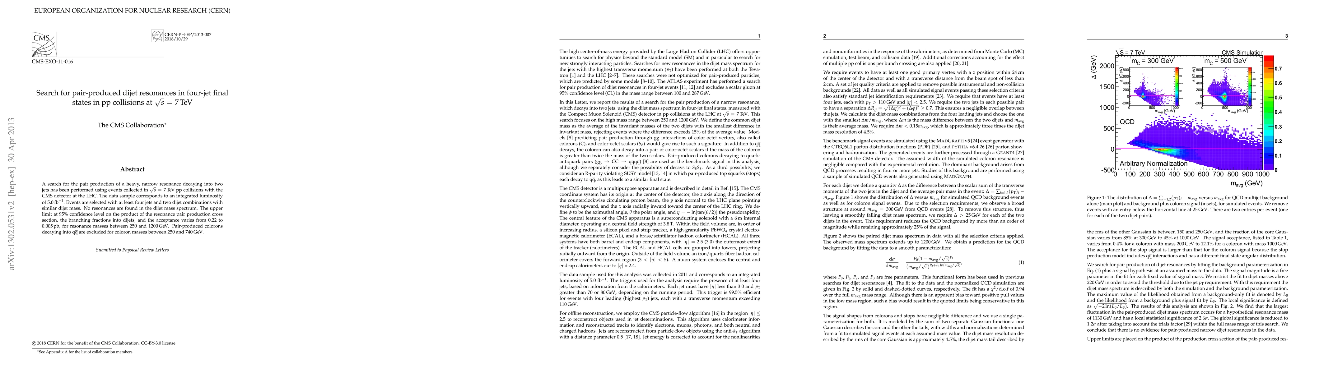 This paper reports a search for pair-produced dijet resonances in four-jet final states at 7 TeV proton-proton collisions using the CMS detector. No resonances were found, setting an upper limit on the production cross section and excluding coloron masses between 250 and 740 GeV.