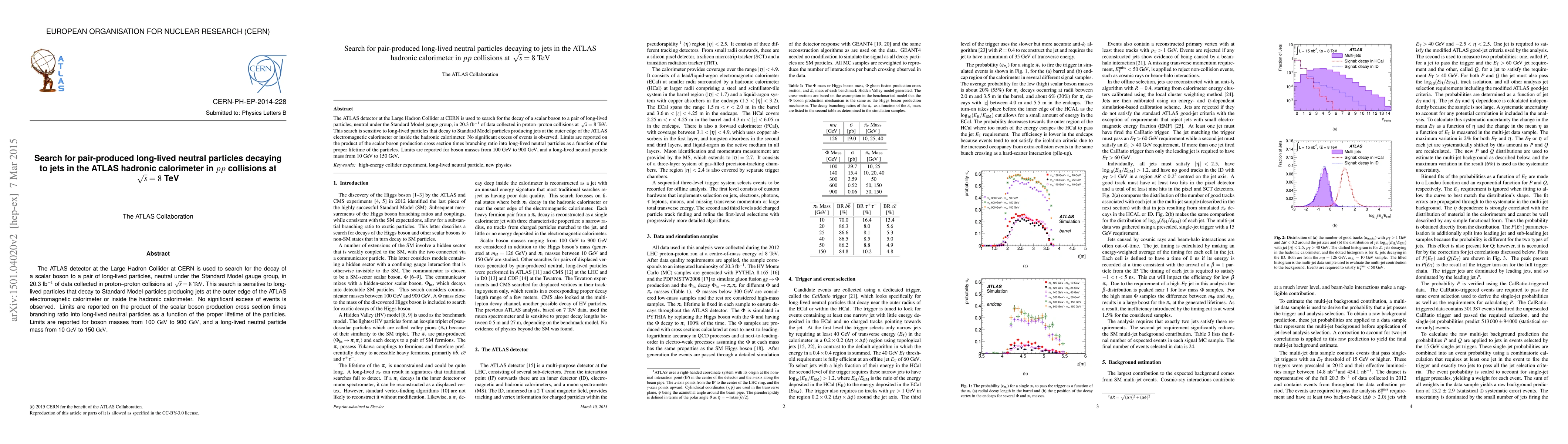 The ATLAS experiment at CERN searched for pair-produced long-lived neutral particles decaying in the hadronic calorimeter using 20.3 fb$^{-1}$ of data from $pp$ collisions at 8 TeV. No significant excess was observed, leading to new limits on the production cross section of scalar bosons decaying into these particles.