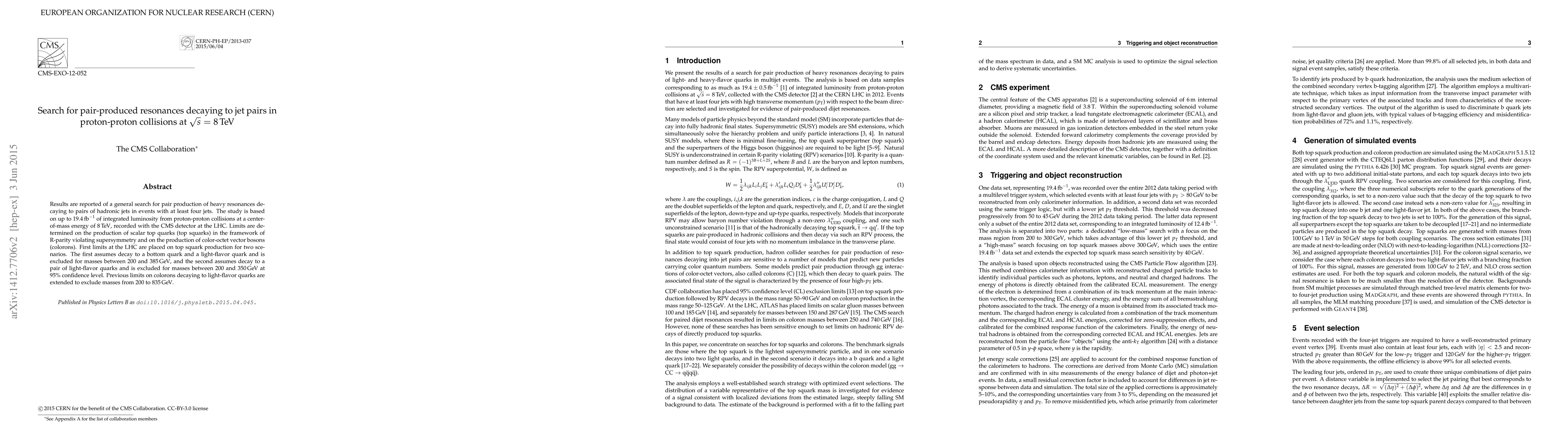 This study, using data from 8 TeV proton-proton collisions at the LHC, sets new limits on the production of heavy particles like top squarks (in R-parity violating supersymmetry) and colorons (color-octet vector bosons). Top squark production for two decay scenarios is excluded for masses between 200-385 GeV and 200-350 GeV, while coloron production is excluded for masses from 200-835 GeV at 95% confidence level.