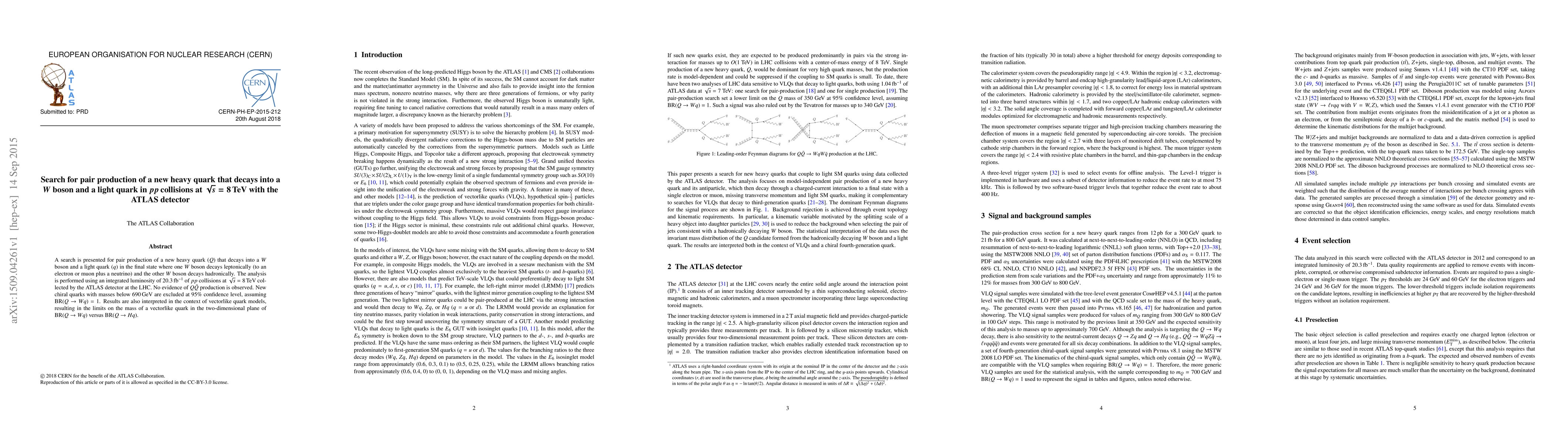 Summary: The ATLAS experiment searched for pair production of a new heavy quark decaying into a $W$ boson and a light quark in $pp$ collisions at 8 TeV, finding no evidence of such particles. The study excludes new chiral quarks with masses below 690 GeV at 95% confidence level.