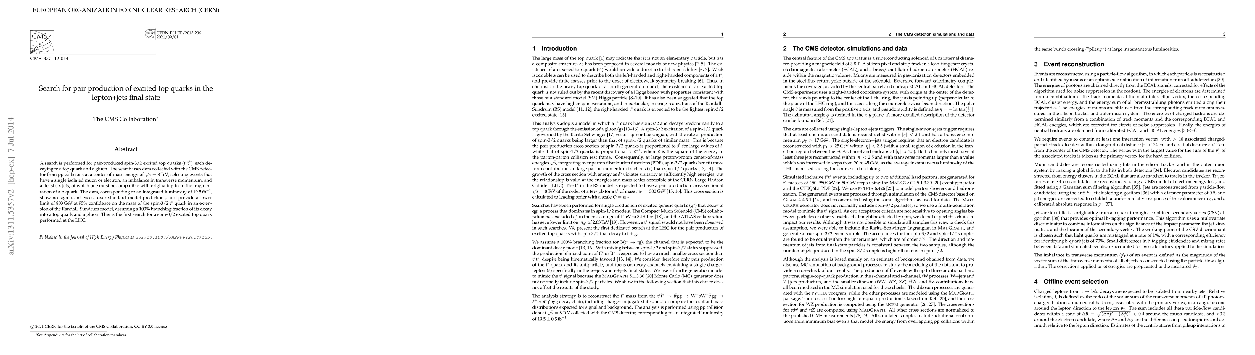 This study by CMS experiment at LHC searches for excited top quark pairs (t*t-bar) decaying into a top quark and a gluon, using 8 TeV proton-proton collision data. Analyzing events with one lepton, missing momentum, and jets including a b-jet quark, no significant signal above background was found. This sets a 95% confidence limit of at least 803 GeV on the mass of the spin-3/2 excited top quark, marking the first such search at the LHC.