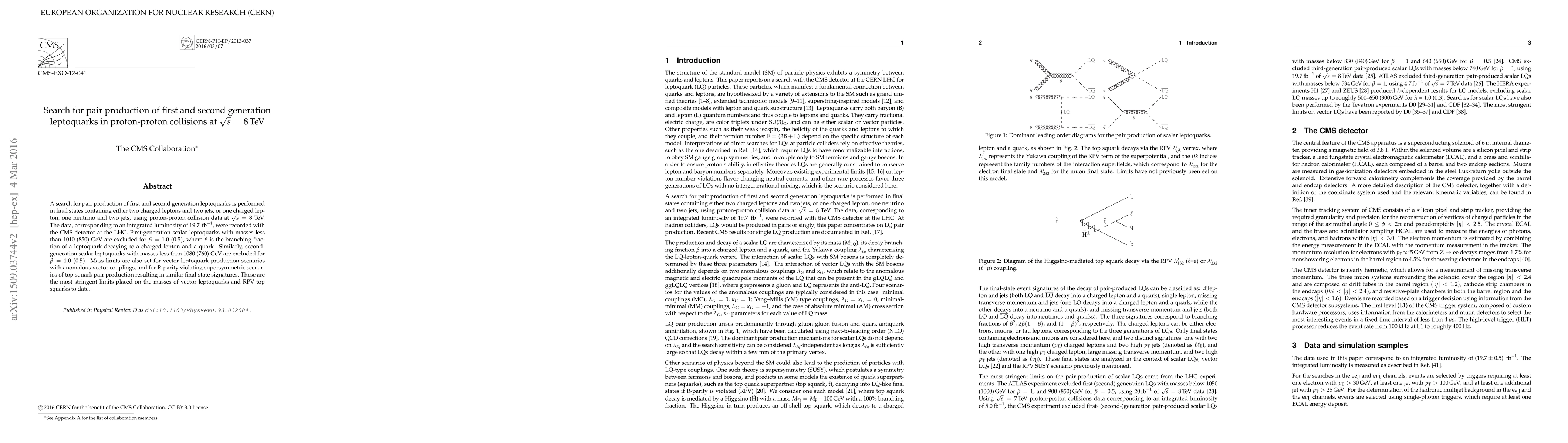 This paper reports a search for first and second generation leptoquark pair production in proton-proton collisions at 8 TeV using CMS data, setting stringent limits on their masses. No leptoquarks were observed, leading to exclusions for masses below 1080 GeV for second-generation leptoquarks and 1010 GeV for first-generation leptoquarks.