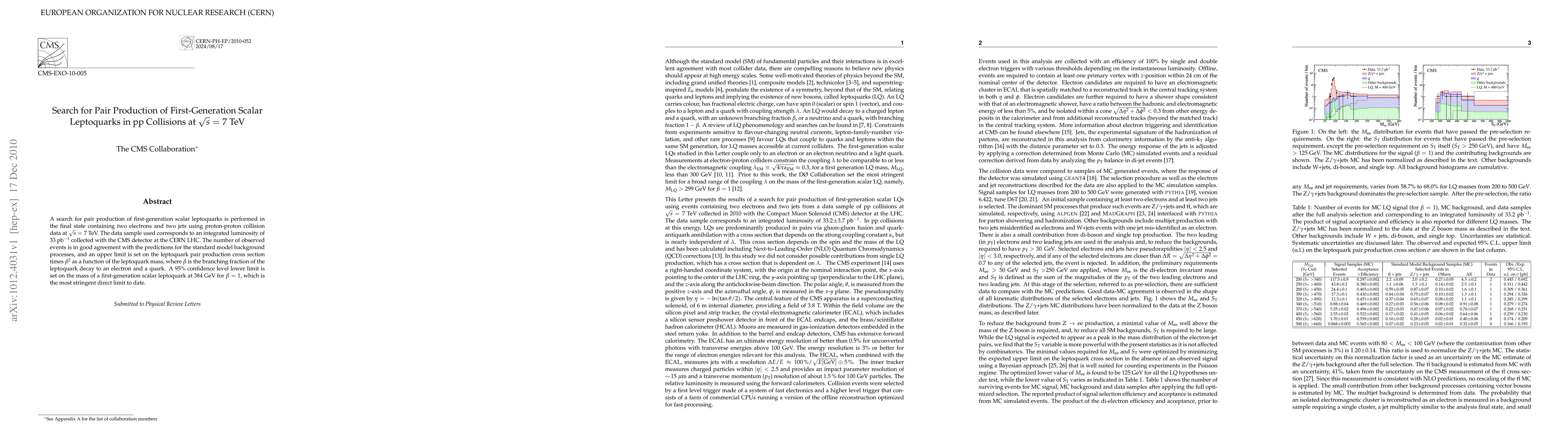 A search for pair production of first-generation scalar leptoquarks is performed in the final state containing two electrons and two jets using proton-proton collision data at sqrt(s)=7 TeV. The data sample used corresponds to an integrated luminosity of 33 inverse picobarns collected with the CMS detector at the CERN LHC. The number of observed events is in good agreement with the predictions for the standard model background processes, and an upper limit is set on the leptoquark pair production cross section times beta^2 as a function of the leptoquark mass, where beta is the branching fraction of the leptoquark decay to an electron and a quark. A 95% confidence level lower limit is set on the mass of a first-generation scalar leptoquark at 384 GeV for beta=1, which is the most stringent direct limit to date.
